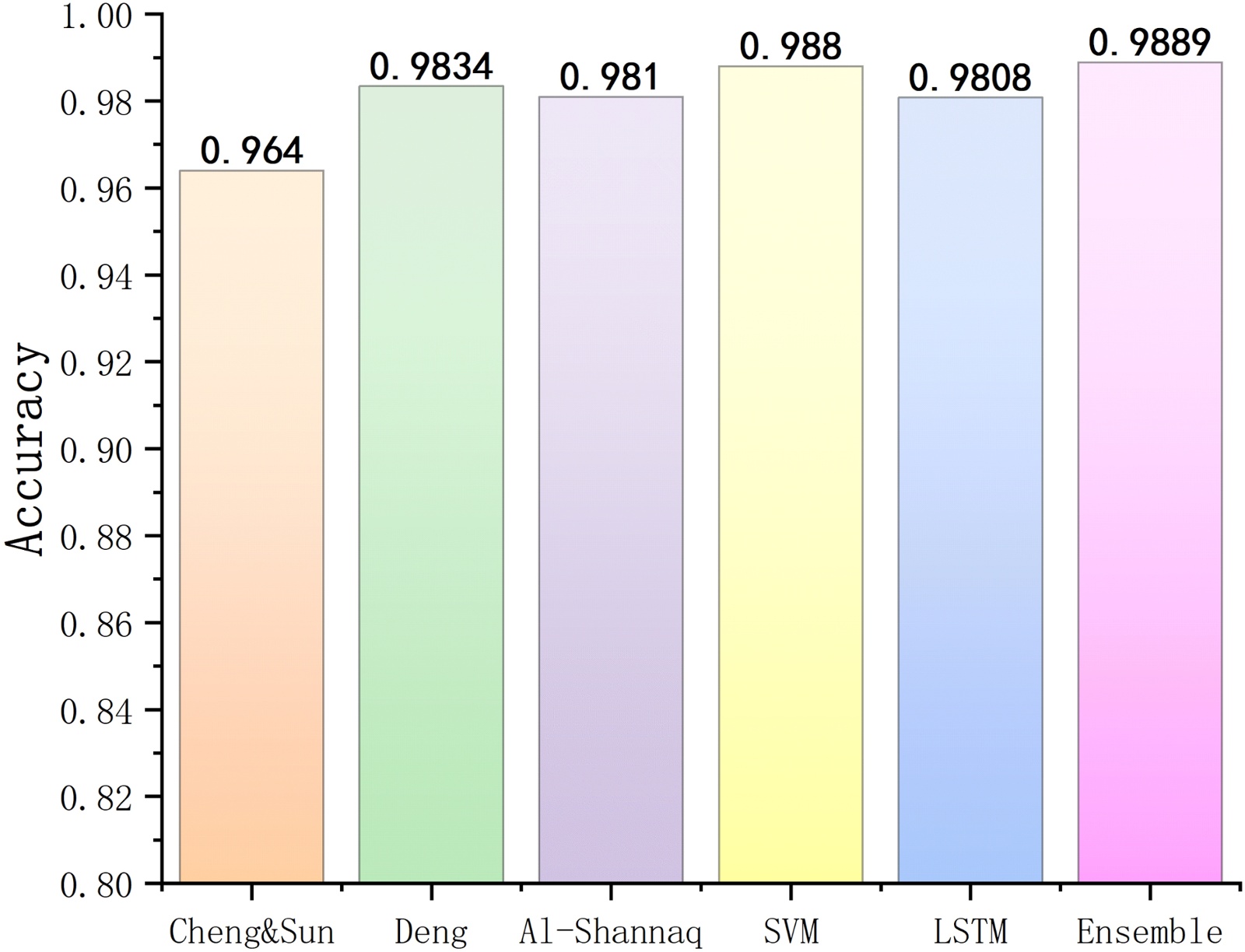 图14展示了三篇已有研究与本文所提出的三种模型在相同数据集上的分类准确率对比情况。已有文献中,Al-Shannaq等的方法准确率为98.1%,Cheng和Sun [28]的模型达到96.40%,而Deng M等[29]的卷积神经网络模型仅为98.34%。相比之下,本文提出的三种模型在相同数据集上均取得了更高的准确率,其中SVM模型为98.80%,LSTM模型为98.08%,融合模型(Ensemble Model)最高,达到98.89%。整体来看,本文的方法在心音信号分类任务上显著优于其他几篇已有的研究成果,说明所设计的模型能够更有效地捕捉心音信号的特征,提高分类性能,为临床辅助诊断提供更可靠的支持。