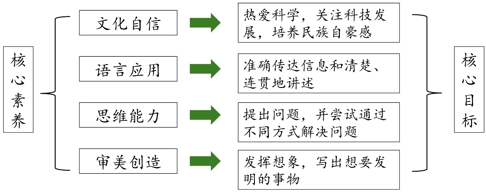 如统编版语文四年级下册第二单元的人文主题是“科普文”,关照人文主题本单元设置的语文要素是“阅读时能提出不懂的问题,并试着解决”。本单元三篇课文的课后都有“提问题并解决”的要求,“语文园地”中的“交流平台”栏目还总结了解决问题的三种方法。将“人文主题”和“语文要素”对接核心素养的四个维度,我们还可以进一步细化核心目标:文化自信——热爱科学,关注科技发展,培养民族自豪感、语言运用——准确传达信息和清楚、连贯地讲述、思维能力——提出问题,并尝试通过不同方式解决问题、审美创造——发挥想象,写出想要发明的事物(如图1)。