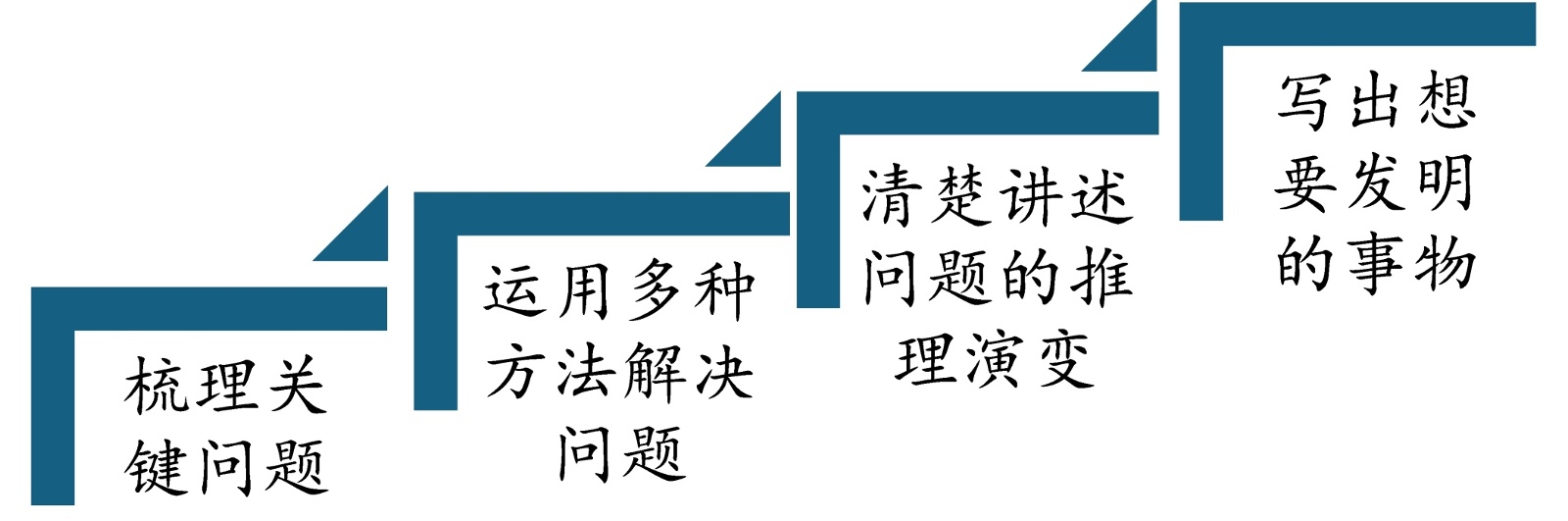 由此确定本单元的学习进阶为四个阶段:学生首先要主动记录、梳理关键问题;之后需要老师介入,为学生提供支架,帮助学生通过思维导图等方式将课文结构化,在解决关键问题的过程中学习运用多种方法;然后学生将借助资源或工具讲述问题的推理演变;最后发挥想象,写出想要发明的事物。基于此,确定了本单元的四个进阶要点(如图2)。