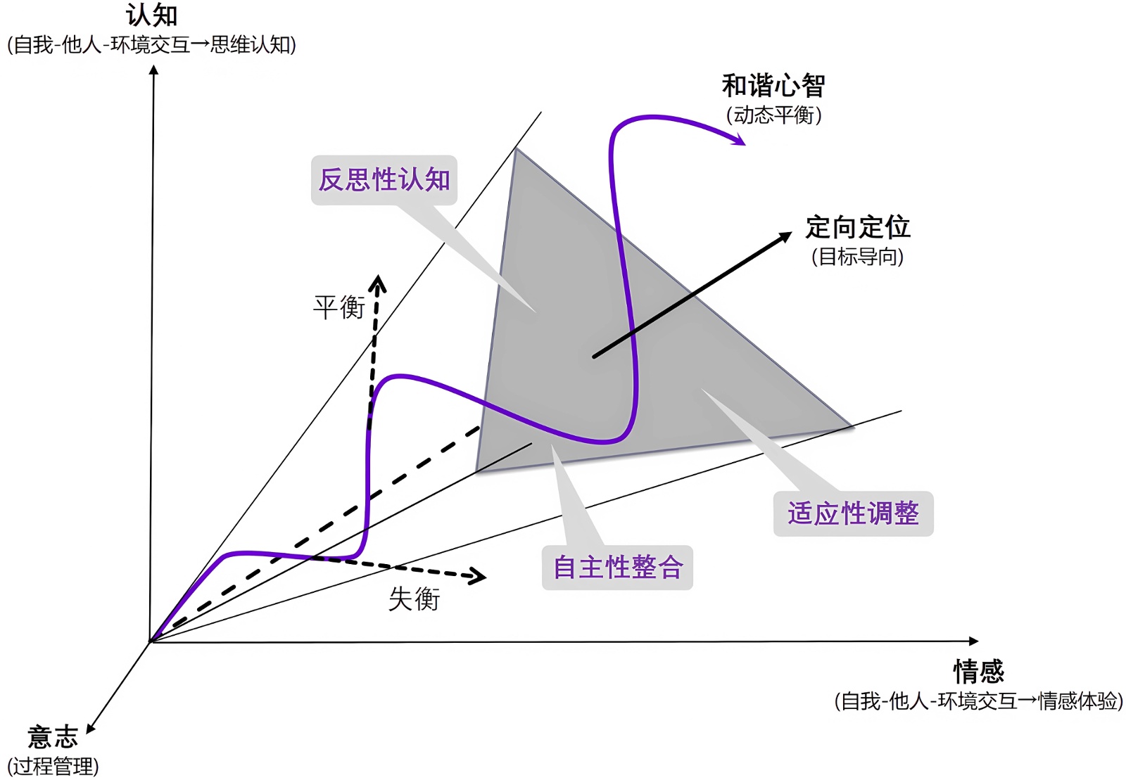 根据以上分析,可以发现:和谐心智由认知–现实校准、情感–需求适配、意志–行动闭环三个模块构成,三者在动态互动中实现个体的内在稳定与外部适应(图1)。