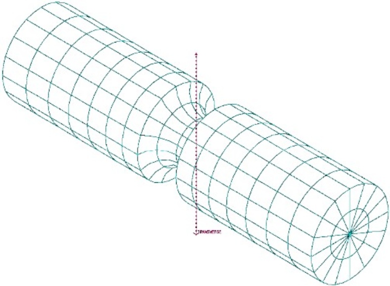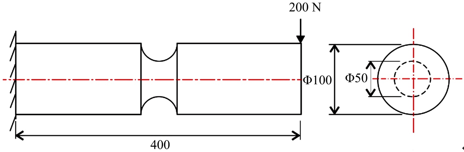 采用计算的几何结构是直径为Φ100 mm,长度为400 mm,结构中间有一个颈缩,截面为圆弧形状,颈缩的半径为R25 mm。结构一端固支,一端承受方向向下的200 N的集中力载荷[8]。结构模型尺寸和载荷如图2所示。
