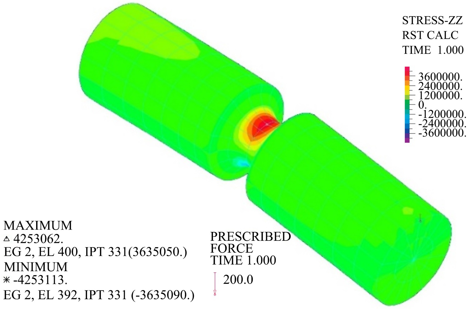 计算完成后,可以显示出模型上的应力值。图5显示的是应力分量σzz,在软件中的应力名称为STRESS-ZZ。从图5可以看到,模型应力最大的位置在颈缩处,位于截面最小的平面,在最顶部的应力最大。这从力学上很容易理解,此处截面积最小,在接受弯矩载荷作用下,该位置的应力和应变都应该是最大的。这也是为什么在3.2节中从这个位置生成SCL线的原因。