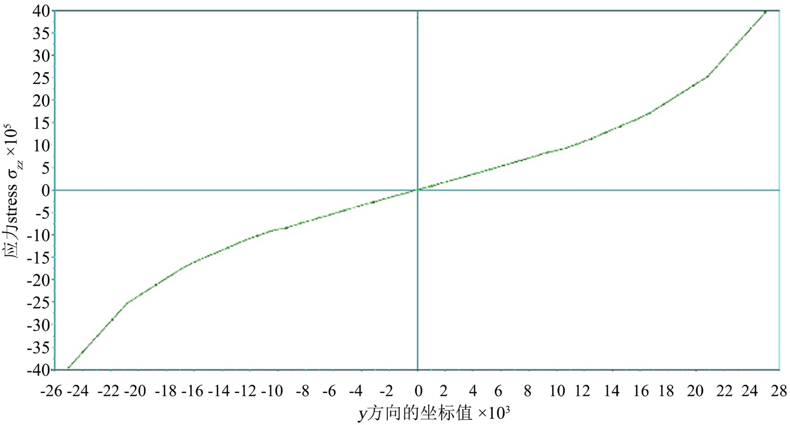 图6是沿SCL线上应力分量σzz (stress-zz)分布,其中横坐标是几何图形上沿轴线方向的坐标。纵坐标是应力分量σzz (stress-zz),即zz方向的应力值。