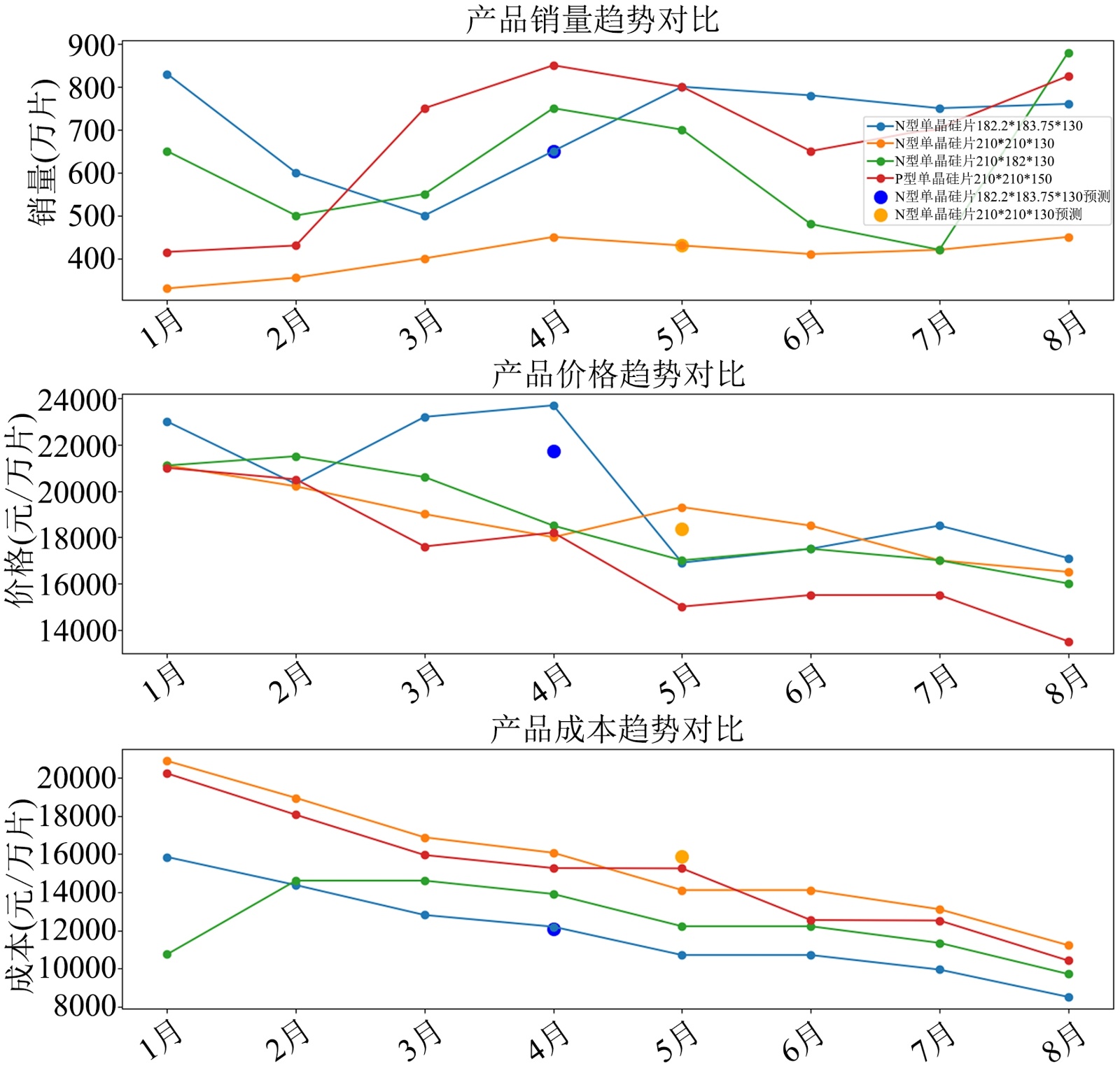 (1) 异常检测与清洗:首先利用统计学方法识别历史数据中的异常点。如图8所示,N型182产品在4月的销量(蓝色点)显著低于相邻月份,这可能是由于设备检修或临时订单取消导致的异常。