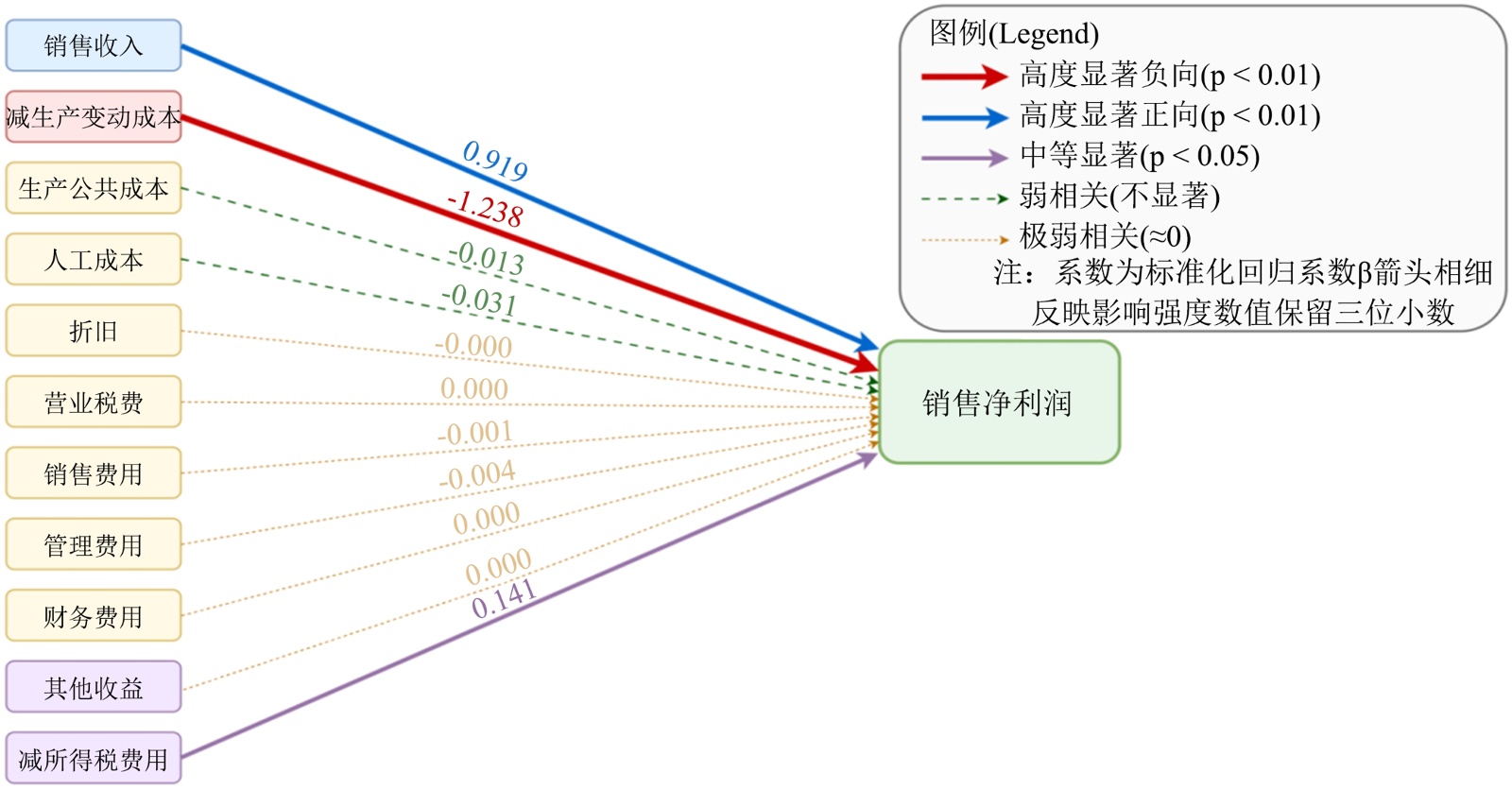 需要说明:表1中的回归系数为标准化回归系数(Beta),用于比较不同变量对净利润影响的相对强弱。回归结果用于刻画统计相关性而非严格因果关系,部分财务科目(如所得税费用)可能与净利润存在同步变化关系,相关结论主要用于识别管理关注重点。