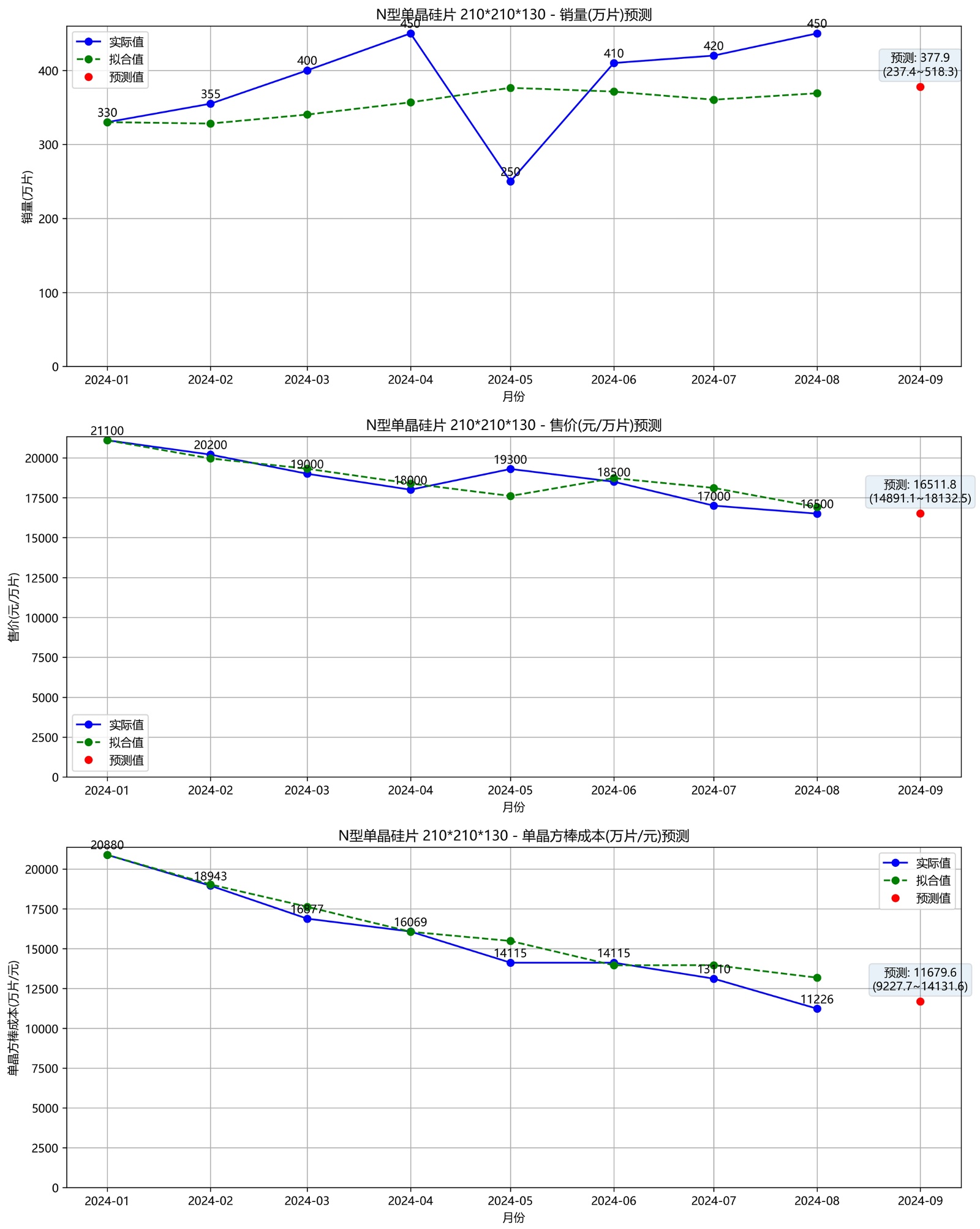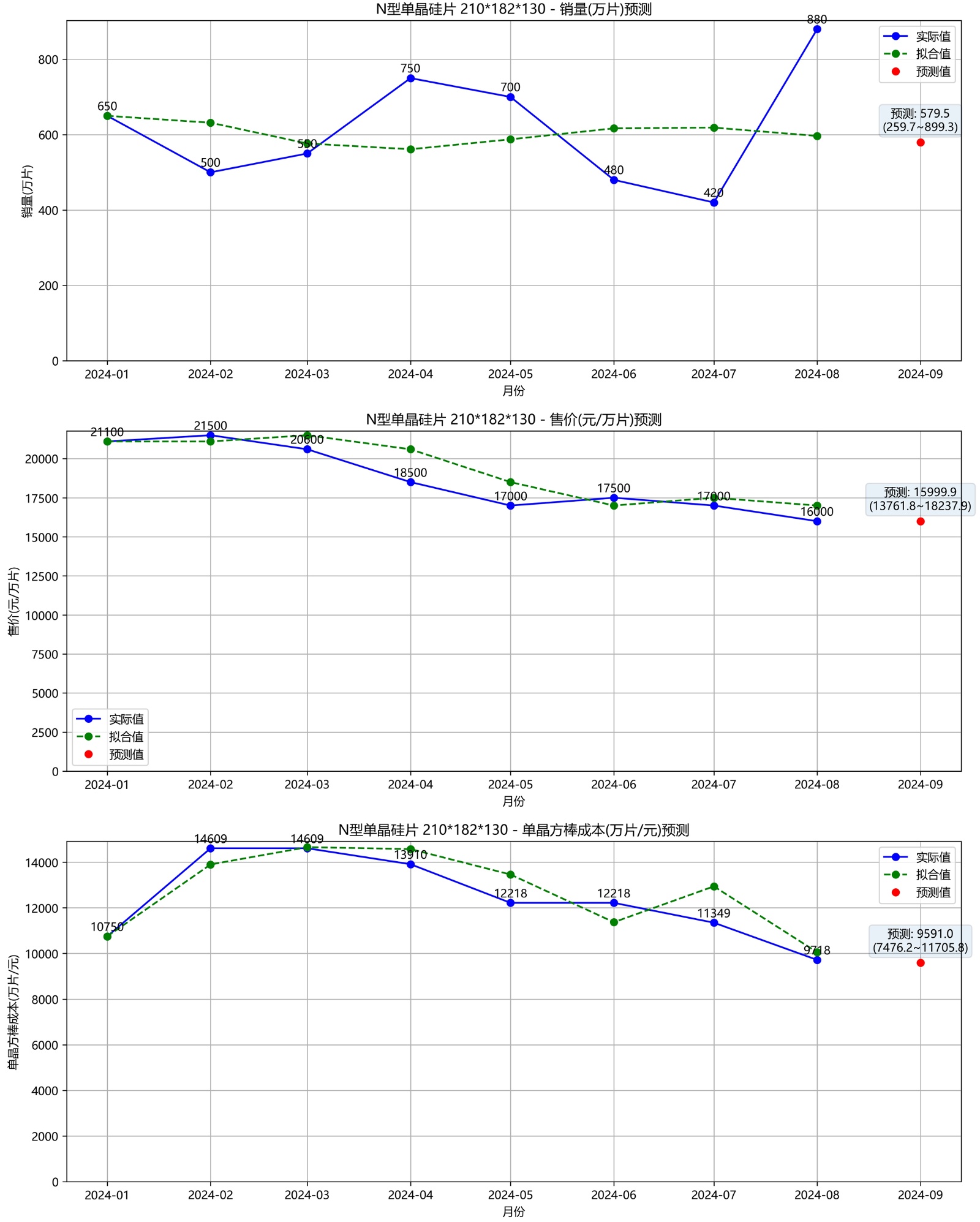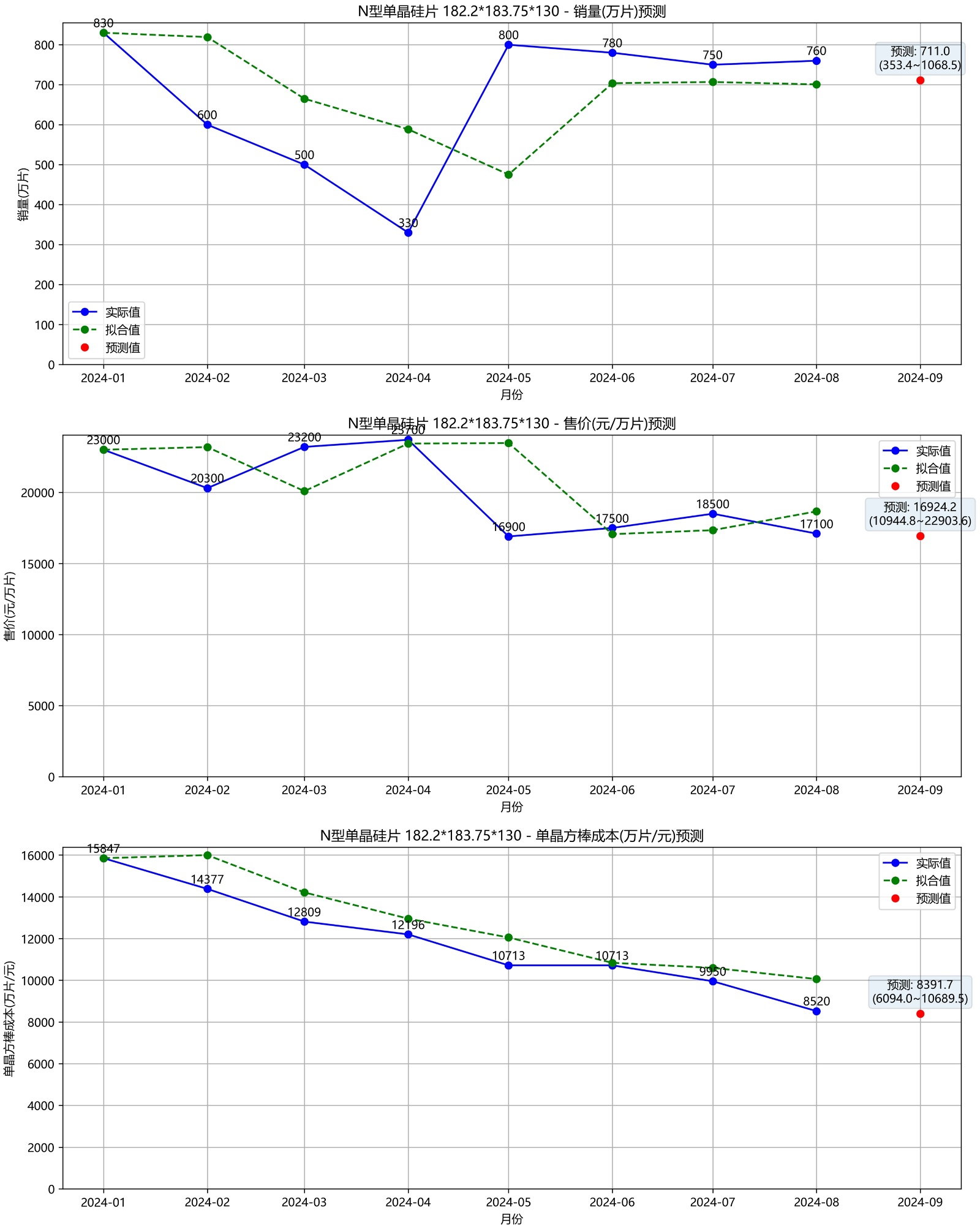(2) 引入ARIMA时间序列模型,对四种主要型号硅片(N型-182、N型-210-210、N型-210-182、P型)的销量、售价及核心变动成本进行短期预测,为企业提供可量化的市场趋势信息。