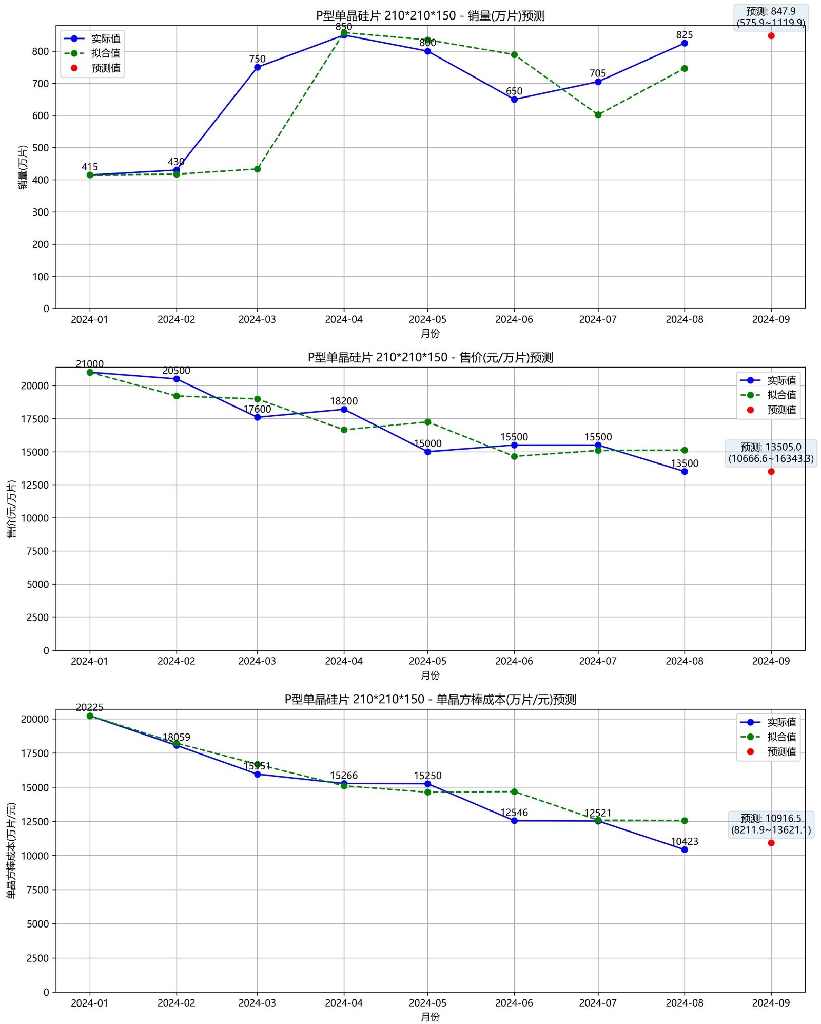 为第i种产品的单位变动成本(元/万片);Qi的单位为万片,Pi的单位为元/万片,F的单位为元,因此Π的单位为元。其中VCi取ARIMA对2024年9月单位成本预测的均值(单晶方棒成本、电费与其他变动成本同口径汇总),以反映短期成本趋势。这里下标P/EP/OP分别表示“单晶方棒/电费/其他变动成本”的类别标记,与售价符号Pi无关。