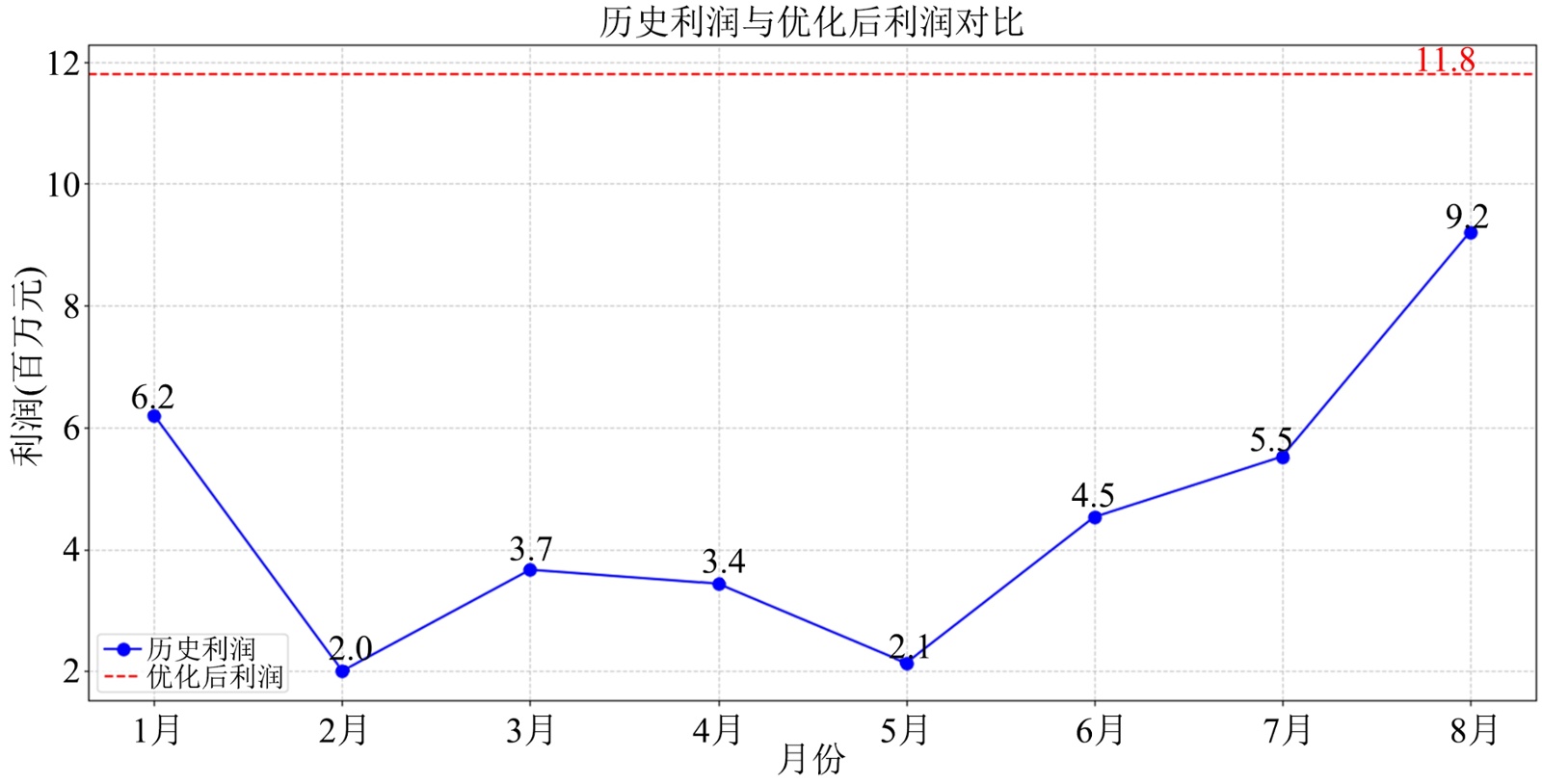 (3) 数学优化效果显著:通过非线性规划模型制定的产销策略,理论上可使企业月经营利润(税前)提升至1179万元,较历史均值提升约163%。