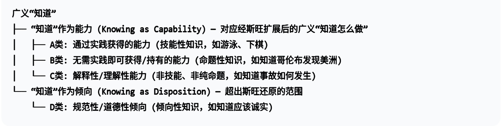 至此为止,在本文中,“能力”与“倾向”被并列为“知道”的两种不同属性范畴,二者虽在哲学传统上同属“倾向性”大概念,但在解释知识类型时具有不可相互还原的理论功能。这一区分是本文突破赖尔–斯旺框架、建立新分类模型的关键。