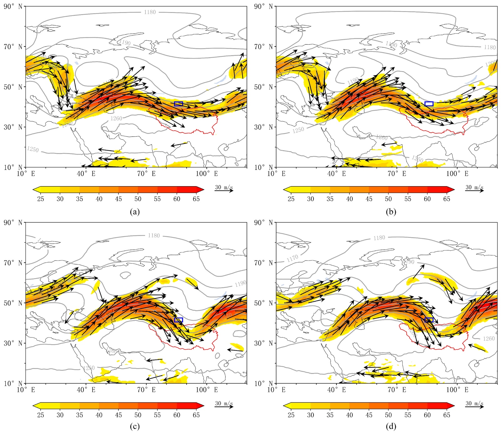 图3. 2025年7月2日08时(a)和20时(b)、2025年7月4日08时(c)和20时(d) 200 hpa位势高度(黑色实线,单位:dagpm),风矢量(黑色箭头,单位:m∙s−1);蓝色矩形框为研究区域