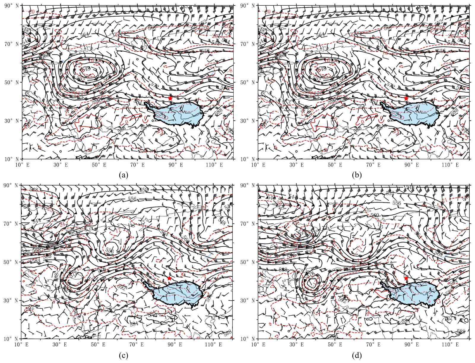 图4. 2025年7月2日08时(a)和20时(b)、2025年7月4日08时(c)和20时(d) 500 hpa位势高度场(黑色实线,单位:dagpm)、温度场(红色虚线,单位:℃)与风场(风羽,单位:m∙s−1)分布;红色星为研究区域