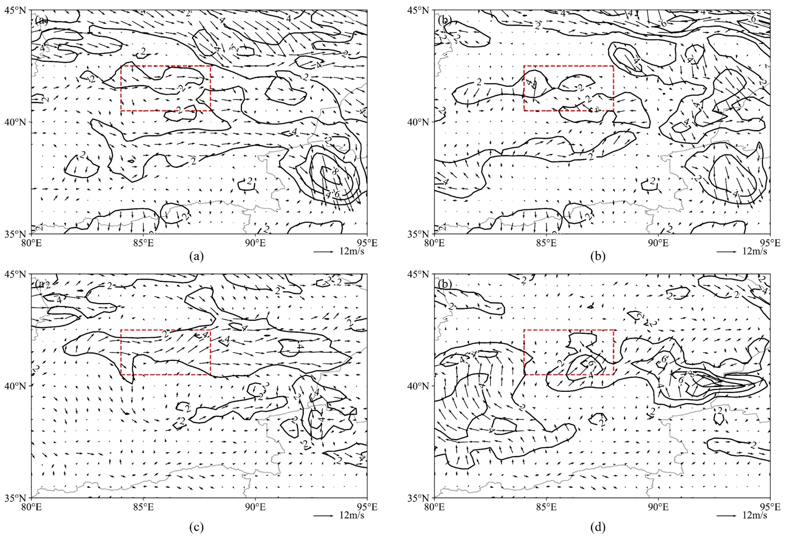 图5. 2025年7月2日20时((a)、(b))、2025年7月4日08时((c)、(d)) 700 hPa和850 hPa水汽通量(等值线,单位:kg∙m−2∙s−1)和风场(箭头,单位:m∙s−1);矩形框为本研究区域