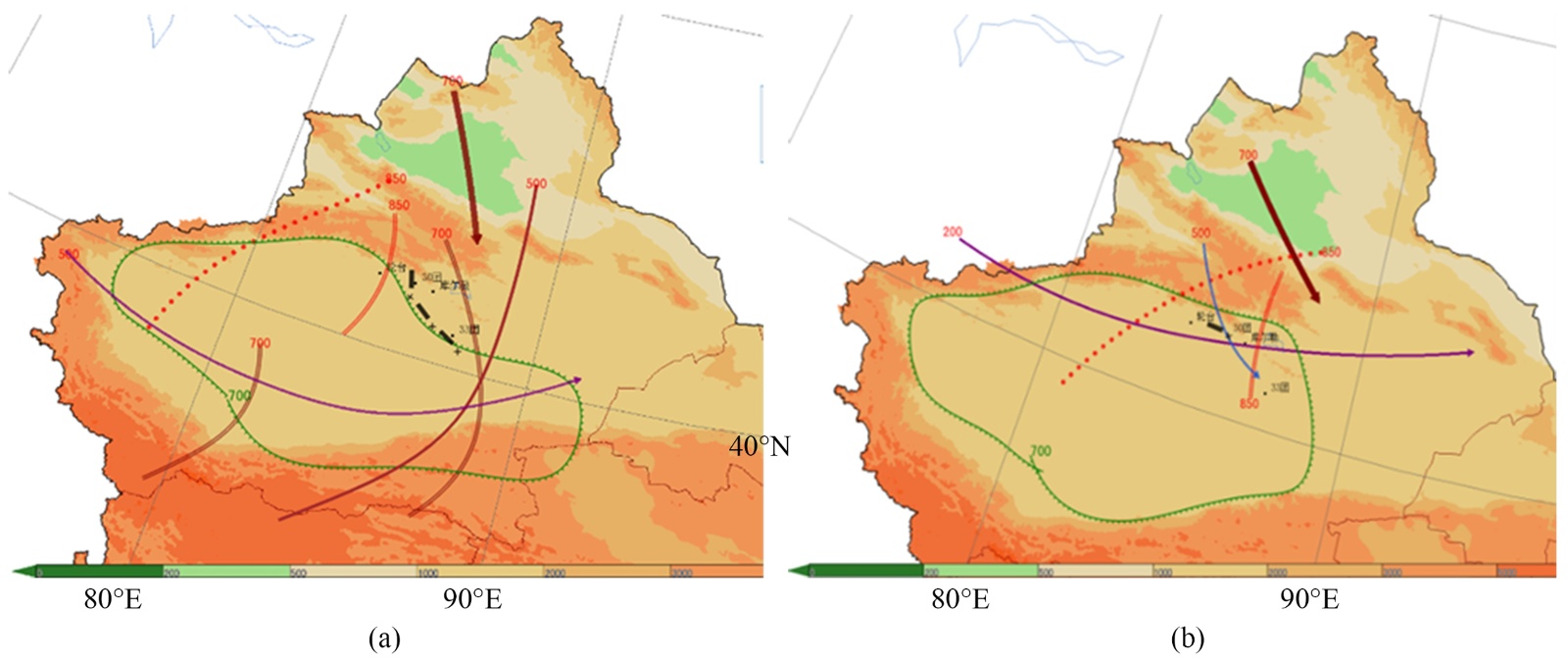 2025年7月2日08时,欧亚范围内500 hPa呈现“两槽一脊”环流形势,巴尔喀什湖至贝加尔湖一带为低槽活动区。至7月2日20时,伊朗副热带高压的588线已位于国境线外,南疆盆地西部位于副高外围;此时,阿克苏地区和巴州地区受副高外围及巴尔喀什湖低槽底部分裂短波的共同影响,导致该地区出现阵性风雨天气(见图4(a)、图4(b))。
