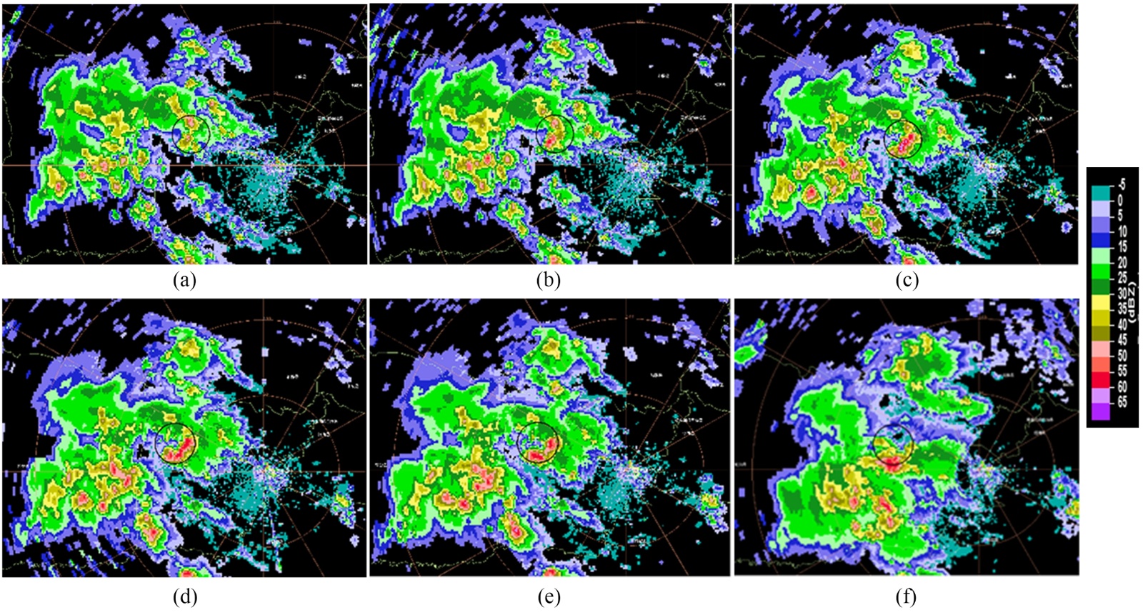 图8. 2025年7月2日新疆铁门关市天气雷达组合反射率因子。(a) 20:59;(b) 21:04;(c) 21:10;(d) 21:15;(e) 21:26;(f) 21:32;(单位:dBZ)