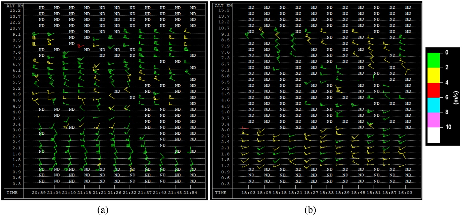 Figure 10. (a) Wind profiler (VWP) from the weather radar in Tiemenguan, Xinjiang, on July 2, 2025, and (b) Wind profiler (VWP) from the weather radar in Korla, Xinjiang, on July 4, 2025 (units: m∙s−1)