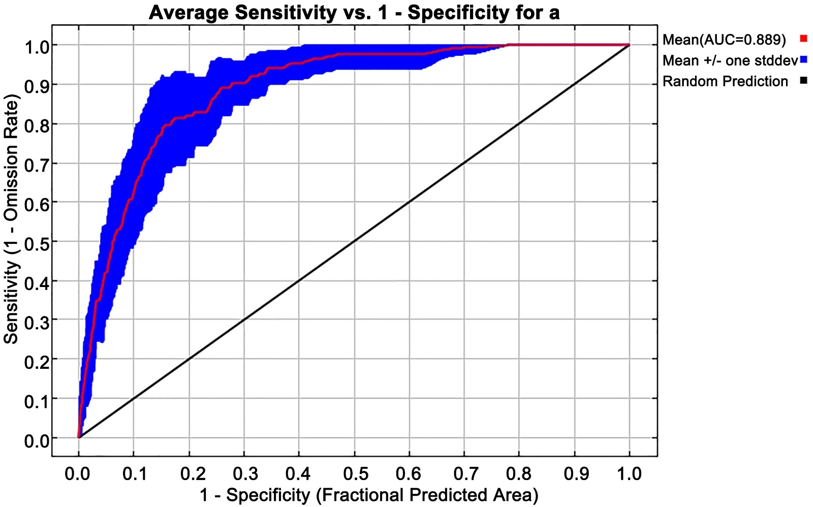 我们将物种点数据和环境因子数据加载到MaxEnt软件中,将训练和测试数据集比例分别设置为75%和25% [12],即3:1,正则化乘数(RM)设置为1,其余参数均为默认值。运用刀切法,迭代5000次,重复10次,输出类型为logistic,输出文件格式为ASCII。模型精度评价通过受试者特征工作曲线ROC (Receiver Operator Characteristic Curve)下面积AUC (Area Under ROC)进行评价来检验MaxEnt模型效果[13]。理论上来讲,AUC值越大,模型预测效果越好[14] [15]。一般认为范围在0.5~0.6为预测失败、0.6~0.7预测结果较差、0.7~0.8为预测结果一般、0.8~0.9为预测结果良好、大于0.9为预测结果优秀,而测试集的平均AUC曲线值为0.889,表明预测精度与模型拟合良好(图2)。