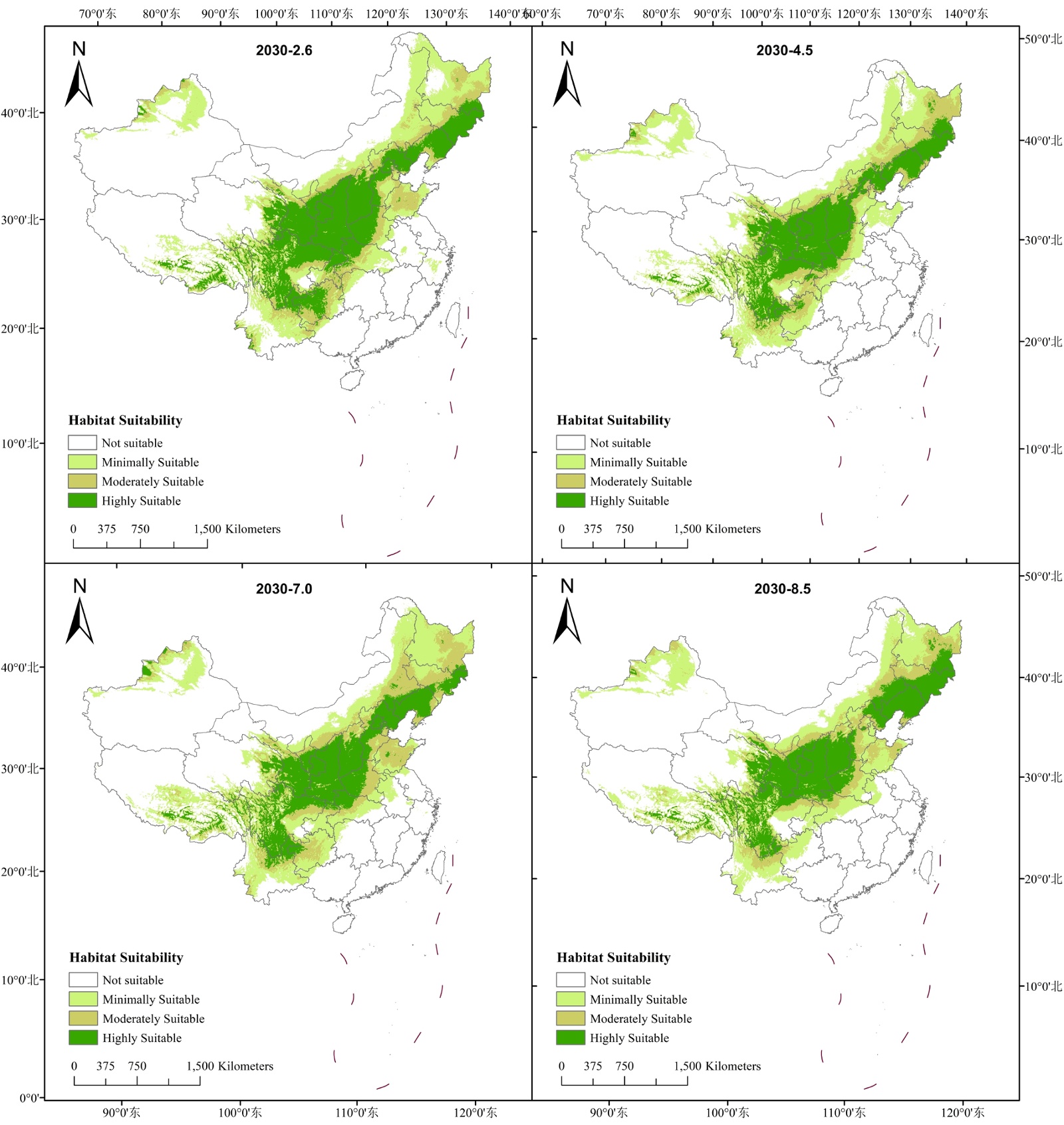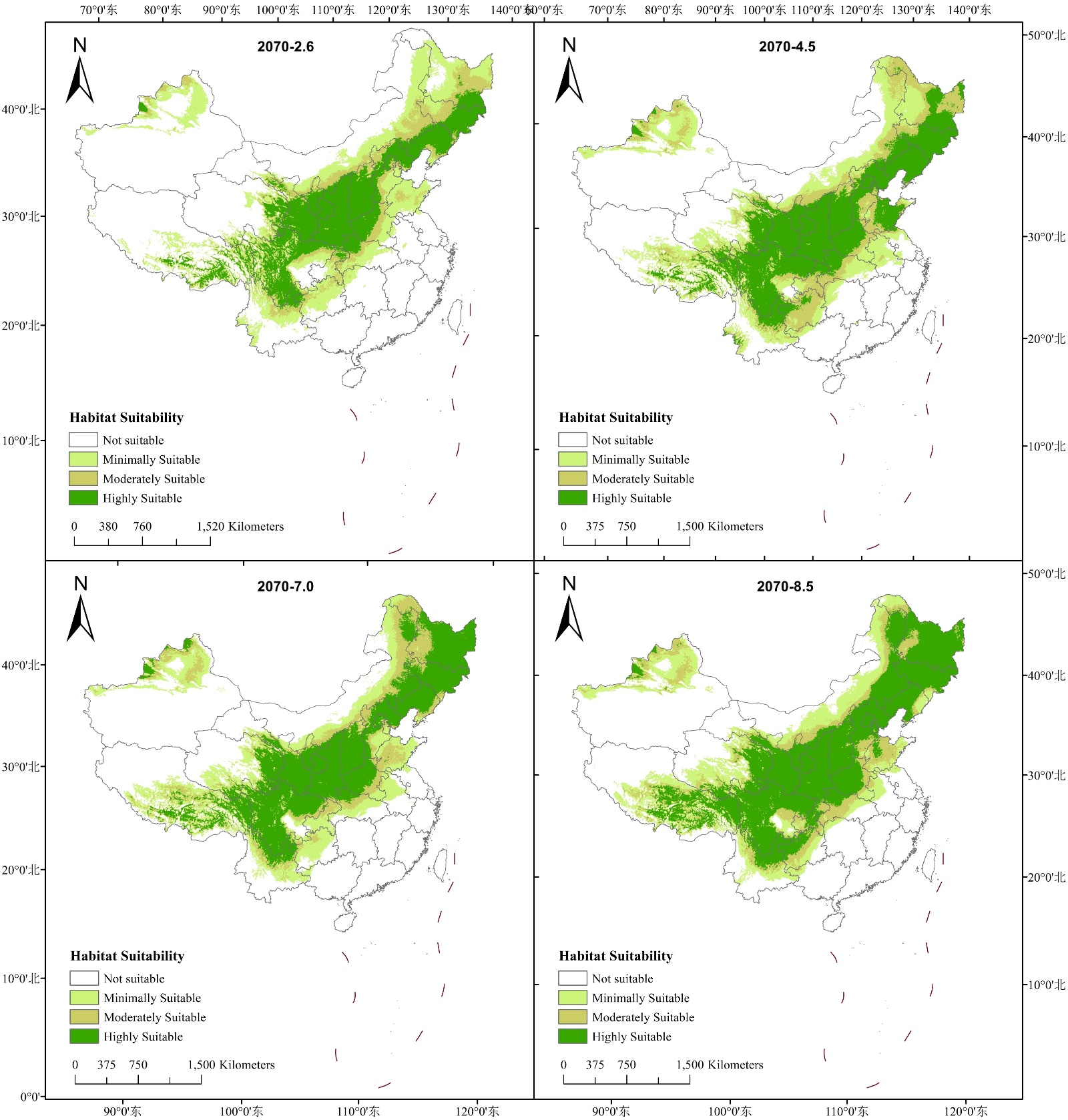 Table 2. Area of suitable habitats under different climate scenarios in various periods