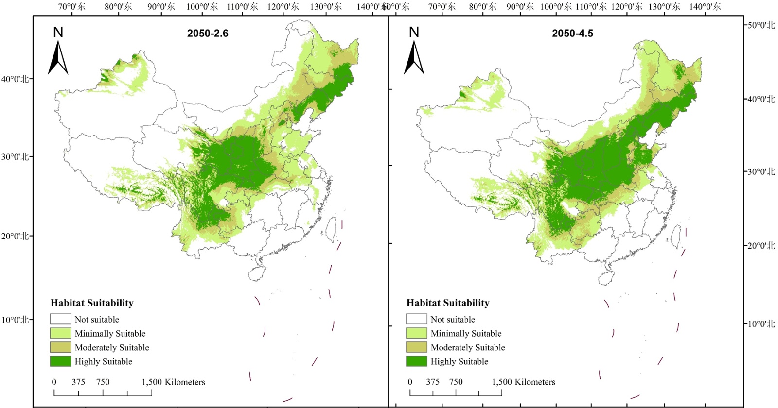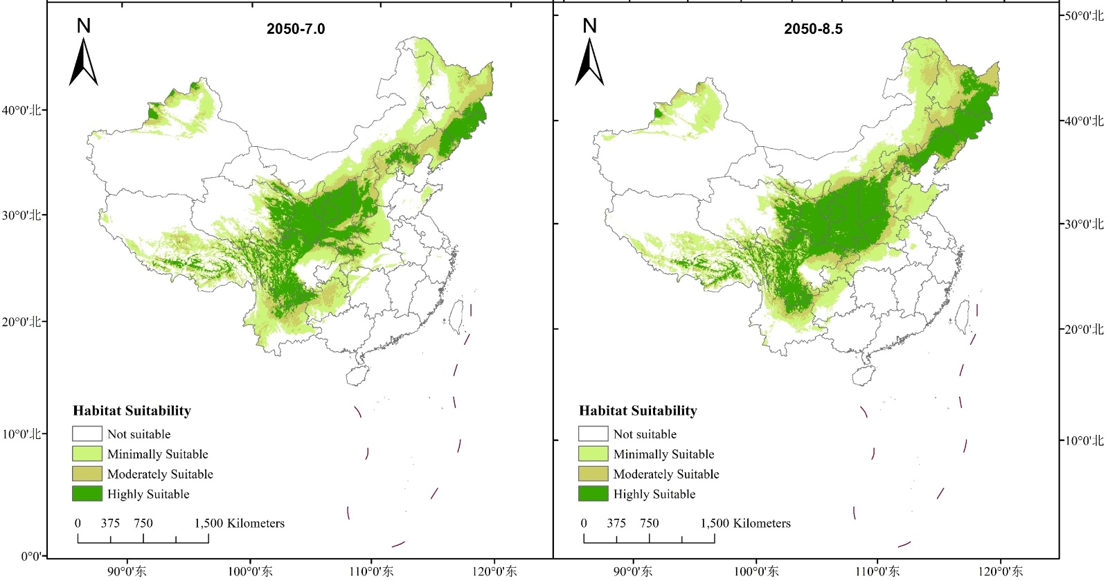 本研究利用MaxEnt模型和ArcGIS利用筛选后的176个分布点和19个生物气候因子探究了欧洲山杨林的潜在分布。根据结果,欧洲山杨林目前潜在适生区主要分布在东北、华北、华中和西南地区。年降水量(bio12)、最冷季度的降水量(bio19)、最冷季度的平均温度(bio11)、年平均温度(bio1)是影响欧洲山杨林分布的关键环境因子。未来四种情境下,欧洲山杨林的适生分布区总体呈现扩大趋势。随着二氧化碳浓度升高,四种气候情境下欧洲山杨林的适生区均向西北和东南扩张。本研究为了解欧洲山杨林对气候变化的响应提供了科学依据,也为山杨林生态系统的管理与规划提供了理论指导和数据支撑,有助于山杨林的植被恢复与生物多样性保护。
