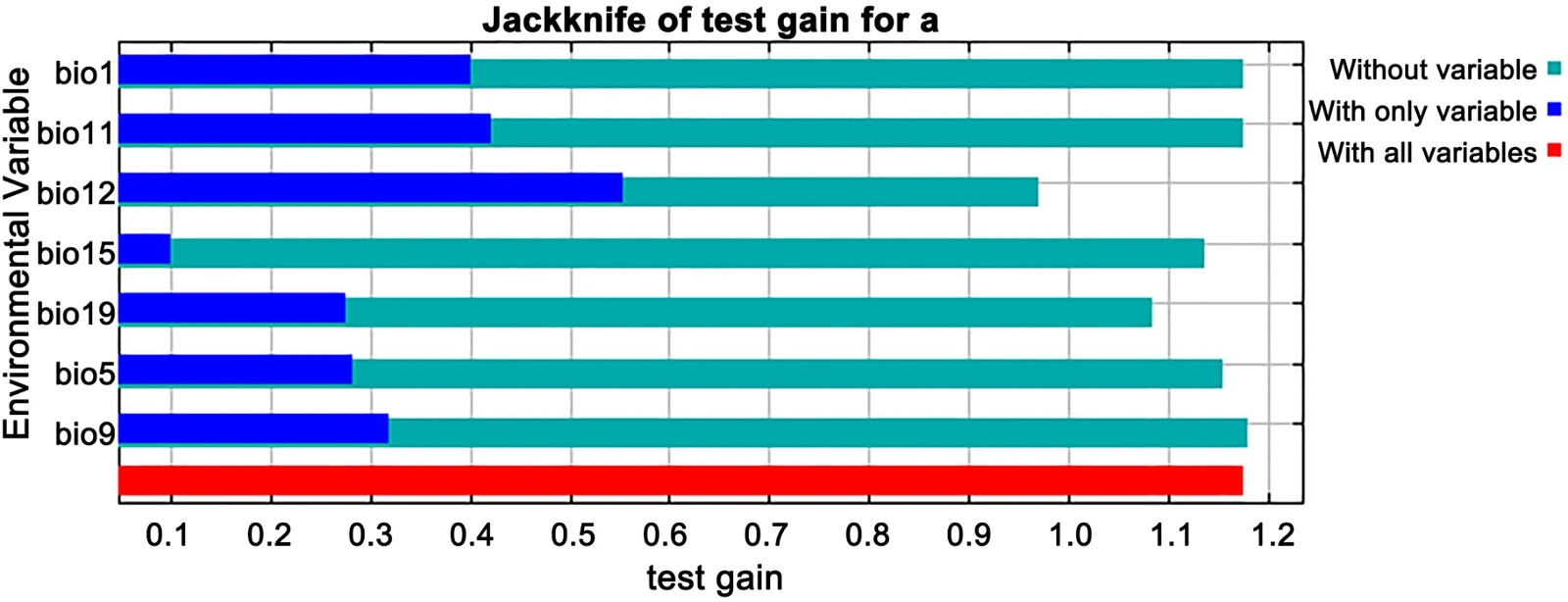 刀切法检验结果可反映不同环境气候因子对于分布增益的贡献大小,图5为使用MaxEnt软件自带的刀切法分析各环境因子对欧洲山杨林分布的重要结果图。分析可知,年降水量(bio12)是主要影响因子,单因子贡献率为31.5%,其次为最冷季度的降水量(bio19)、最冷季度的平均气温(bio11)、年平均温度(bio1)、降水季节性(bio15)、最干燥季度的平均温度(bio9)、最热月份的最高温度(bio5),贡献率分别为14.8%、11.5%、11.4%、7.2%、6%、5.2% (表3)。