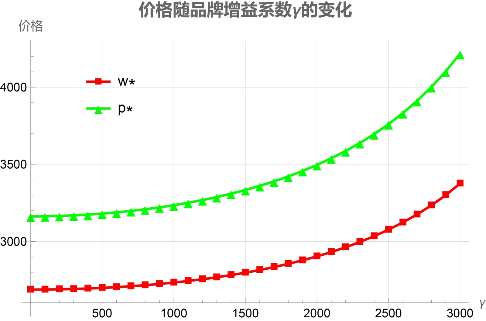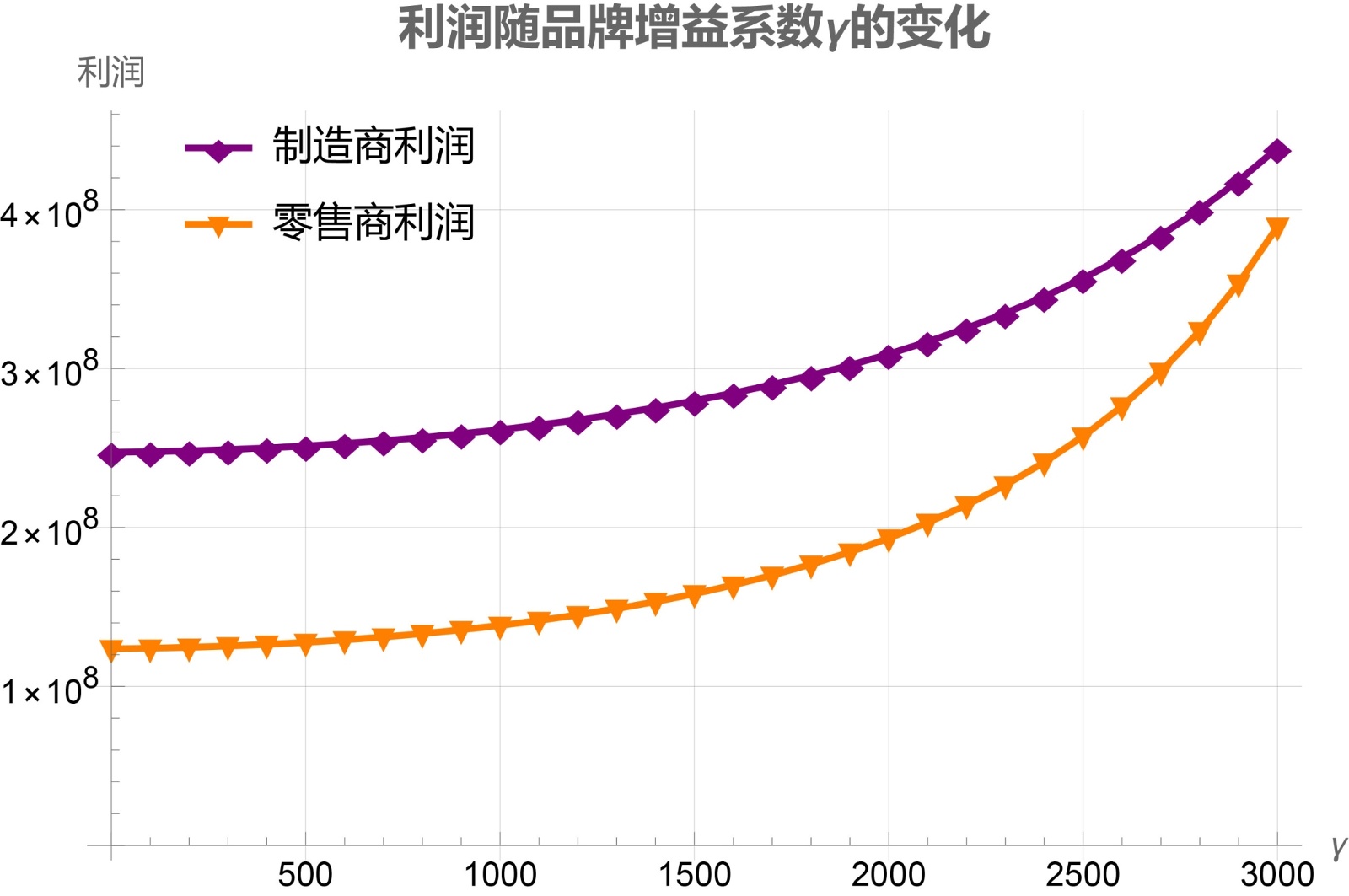 品牌增益系数γ的增加意味着品牌投入能更有效地提升消费者价值感知和购买意愿,这使得需求曲线向右上方移动且变得更为陡峭,消费者对价格的敏感度降低;制造商因此获得定价权,通过提高批发价来回收品牌投资并获取品牌溢价,而零售商也因需求增加和消费者支付意愿增强而能够提高零售价,同时保持足够的销量,从而在供应链各环节实现价值的共同提升。