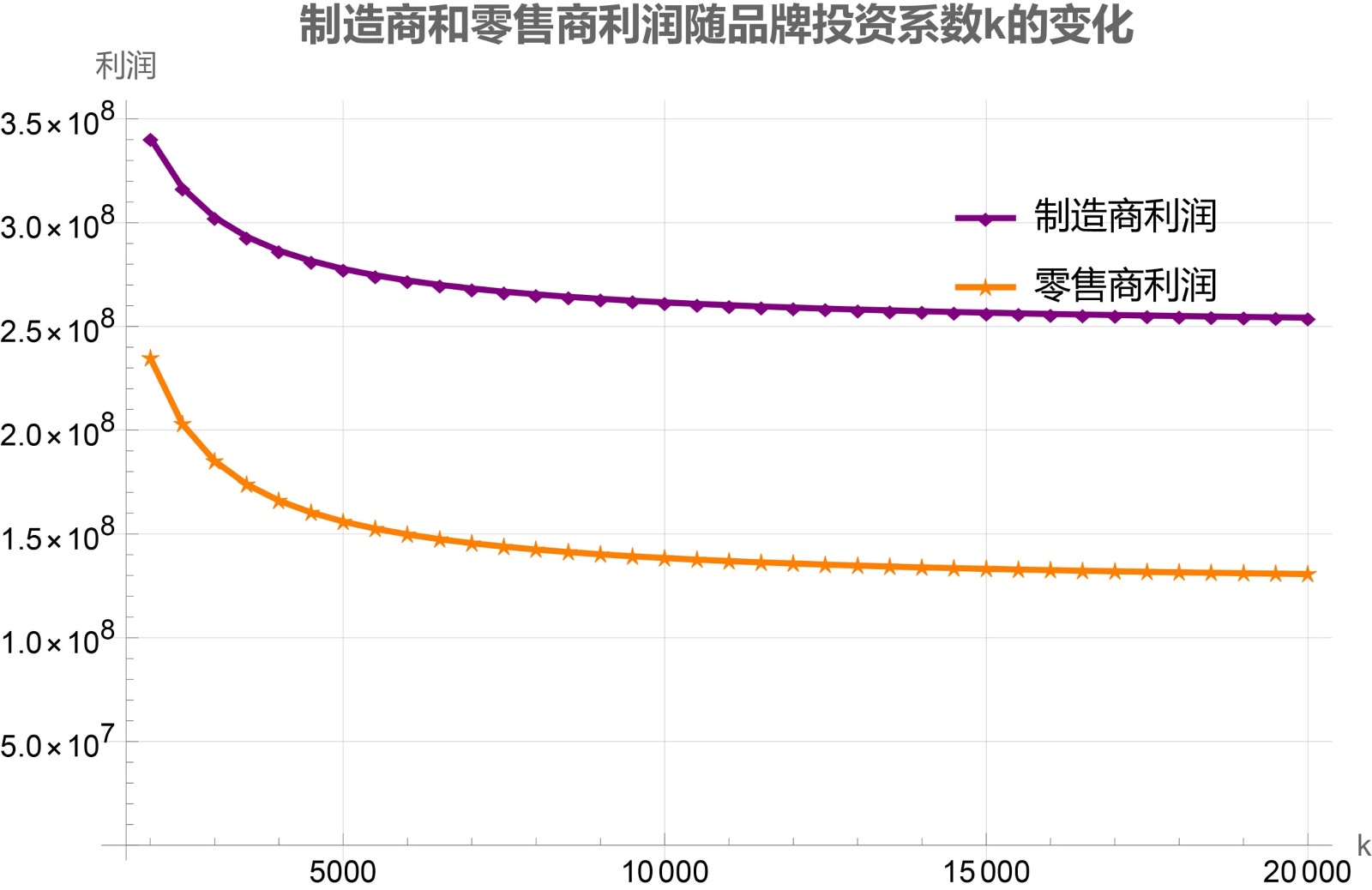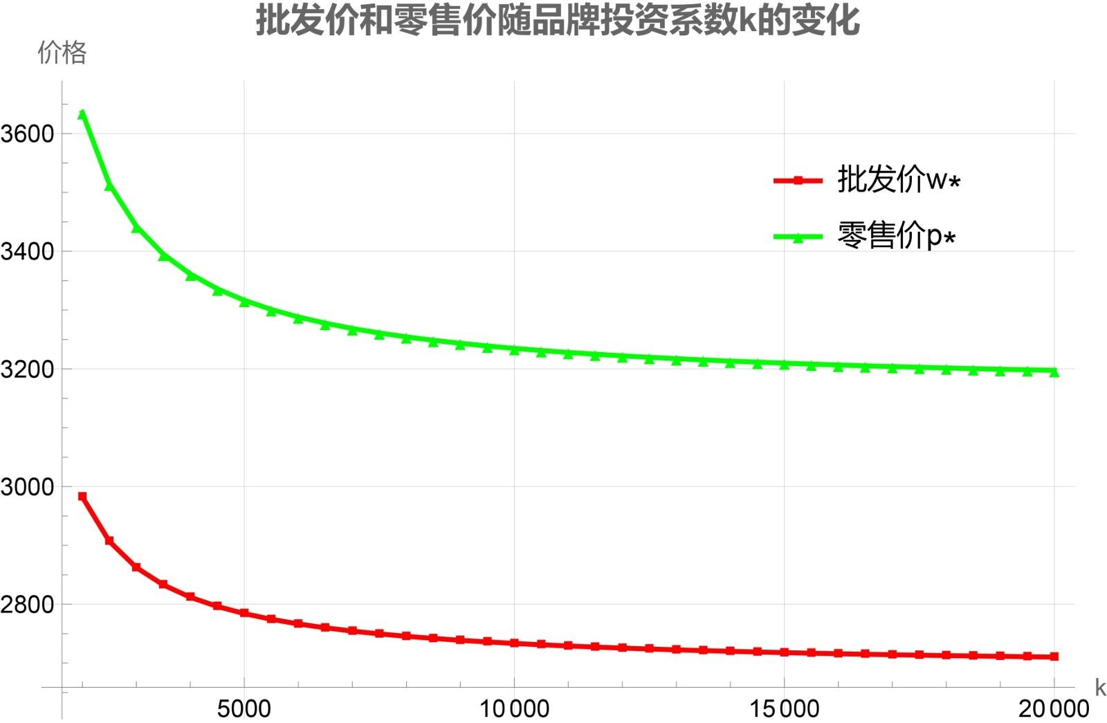 品牌投资系数k的增加意味着品牌投入的成本效率降低,单位品牌建设需要付出更高成本,这迫使制造商减少品牌投入以控制总成本,导致品牌对需求的拉动作用减弱和消费者支付意愿下降;面对疲软的市场需求,制造商不得不降低批发价以维持基本销量,而零售商也因失去品牌溢价支撑和面临更激烈的价格竞争,只能通过降低零售价来刺激消费,从而形成供应链各环节价格同步下降的压力。