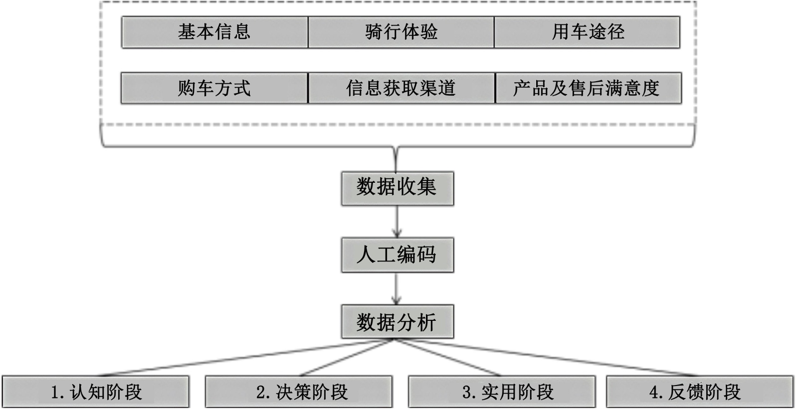 随后,将多选题与开放式编码结果进一步转化为二元变量,即对每名受访者是否提及某一用途、体验或渠道作“是/否”记录,从而构建出“地区 × 是否提及该主题”的列联表,为后续的卡方检验提供数据基础。在变量整理完成后,依据用户旅程(customer journey)的逻辑,将所有变量纳入四个分析模块:1) 认知阶段——信息获取与认知渠道;2) 决策阶段——购车方式与使用用途;3) 使用阶段——骑行过程中的主观体验主题;4) 反馈阶段——对车辆本身及售后服务的整体满意度,后续结果与讨论均围绕这四个模块展开(见图1)。