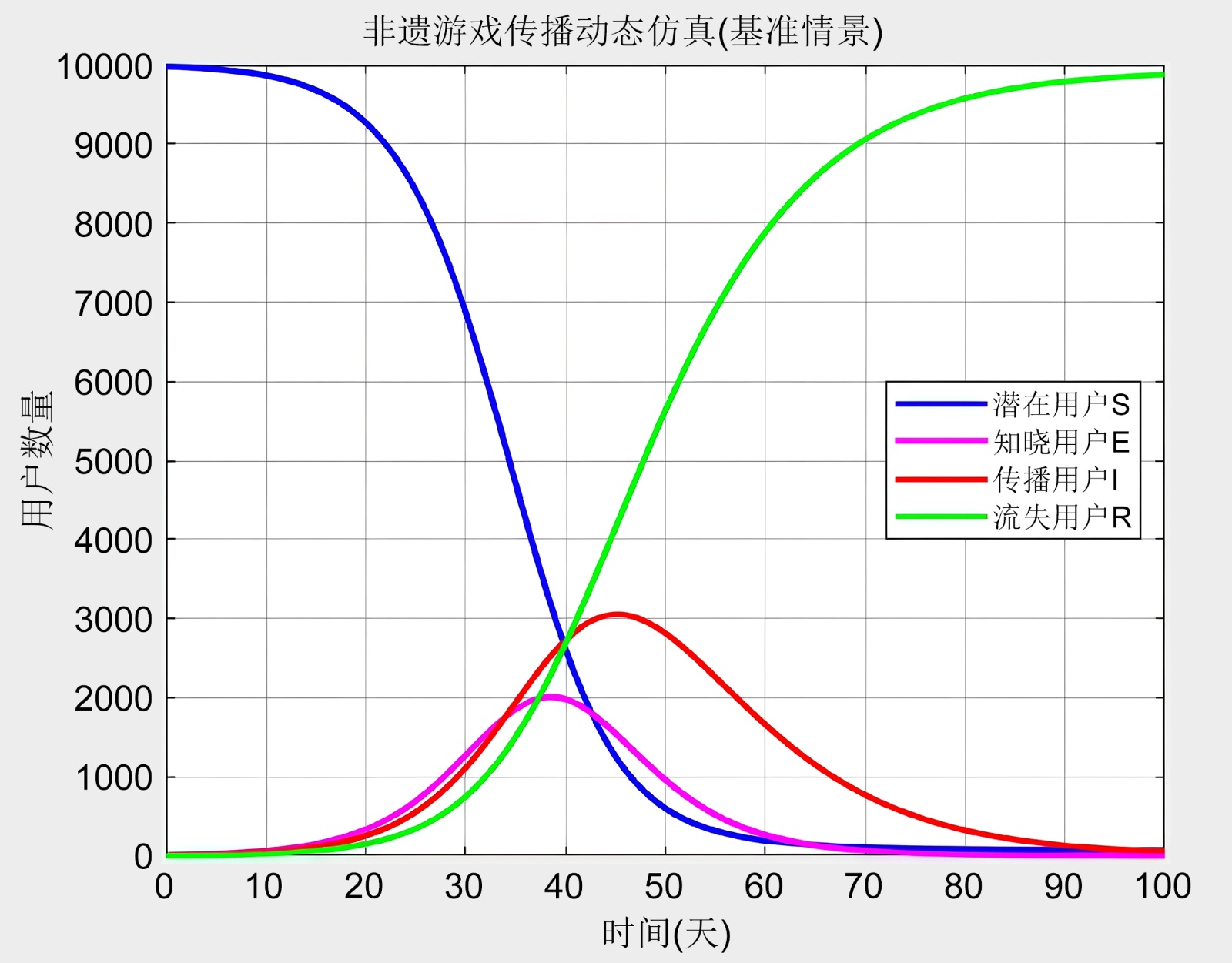 为解决上述问题,本文引入源于流行病学的经典SEIR模型。该模型结构简洁、机理清晰,已被成功应用于信息、谣言、创新扩散等众多社会传播领域的研究。本研究旨在通过将SEIR模型进行合理的概念迁移,构建一个适用于分析非遗游戏传播的动力学模型,将传播速率、转化速率等变量纳入模型参数设计,精准刻画了各因素间的动态关系,突破了传统研究“定性描述为主”的局限,并在此基础上,通过系统的数值仿真实验,旨在模拟非遗游戏在用户群体中传播的典型动态过程,从而识别并量化影响传播效果的关键因素及其作用机制,并基于仿真结果,提炼出具有可操作性的传播优化策略,为相关实践提供参考。