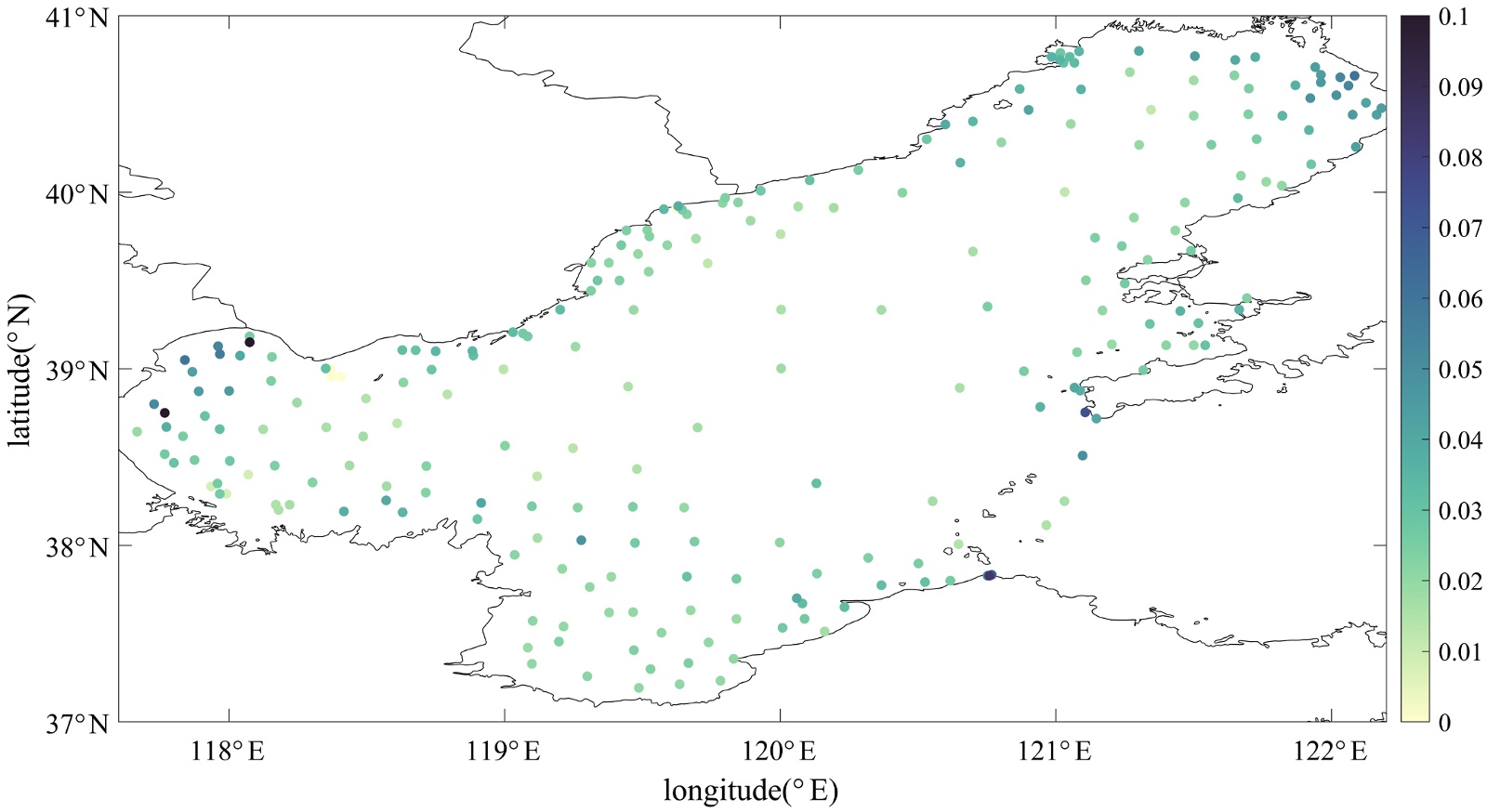 Figure 1. Annual average concentrations of petroleum hydrocarbons at 265 monitoring stations in the Bohai Sea, 2018