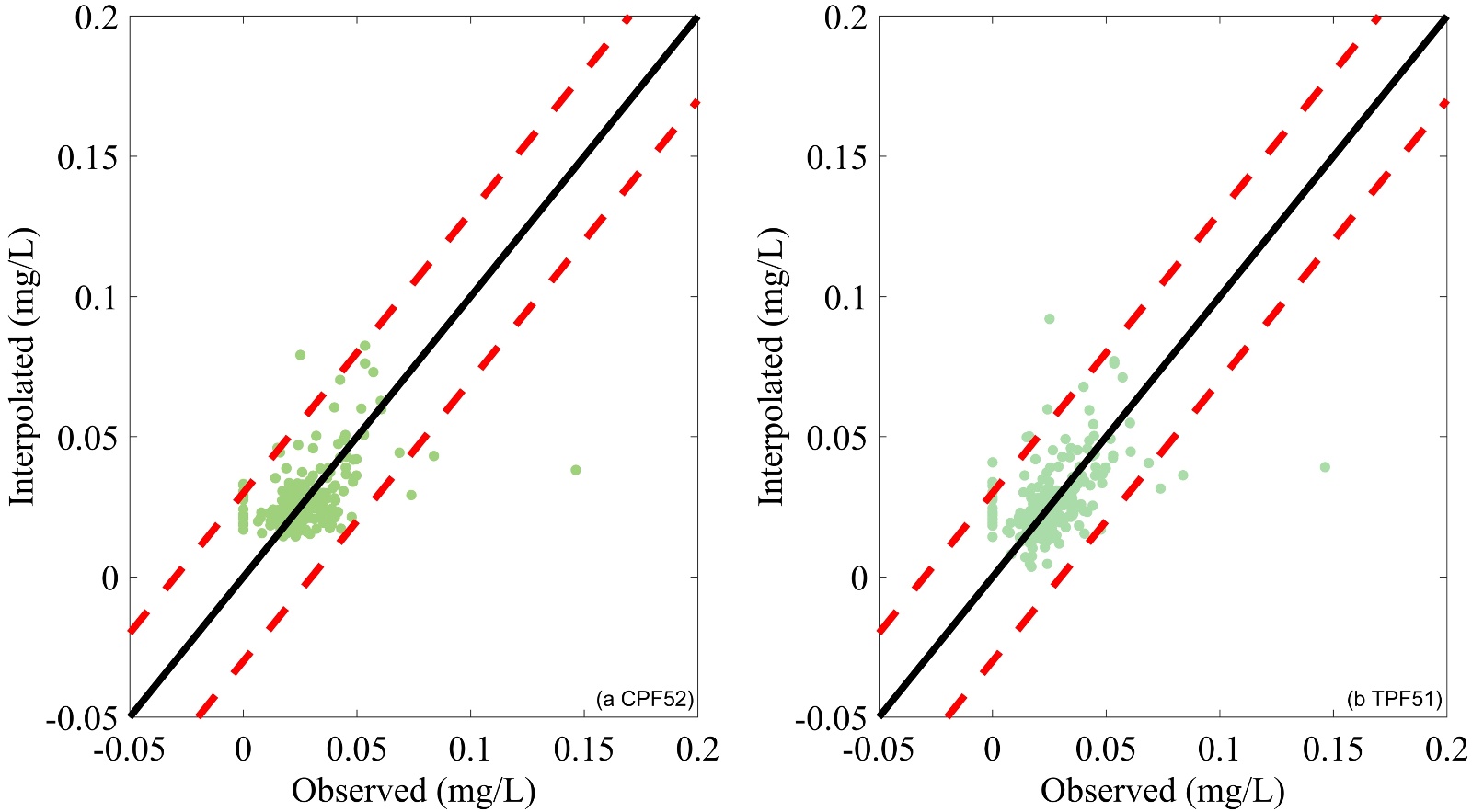 此外,图2显示了在10倍交叉验证条件下,估计值与观测石油浓度呈对比关系。中红色虚线划定偏差小于0.03 mg/L的边界范围。CPF52方法结果表明,其估算的石油浓度与观测值高度吻合,96.54%的值处于偏差小于0.03 mg/L的范围内,充分证明该方法在石油浓度估算中具有高精度与可靠性。相比之下,TPF51结果为95.00%,反映出在石油估算方面与CPF52法存在一定差距,这进一步凸显了CPF52法在本研究中的优势与应用价值,为后续相关研究与实践中的方法选择提供了依据。