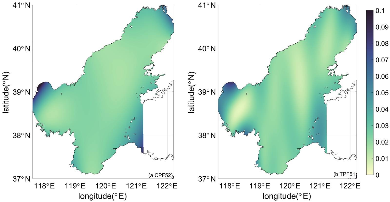 而通过对空间分布结果的深入研究,TPF51虽具有良好的误差表现,但在反映现象真实性的平滑度上不及CPF52 (图3(a)),尤其在渤海区域,TPF51在石油浓度空间分布中呈现明显的“靶心”现象(图3(b)),无法清晰描绘石油烃的空间分布特征。进一步验证了CPF52在渤海油浓度空间分布模拟任务中具备显著的性能优势,如图3所示。基于上述分析,CPT52是本研究中建模石油浓度的最优插值方法,交叉验证结果支持该结论。