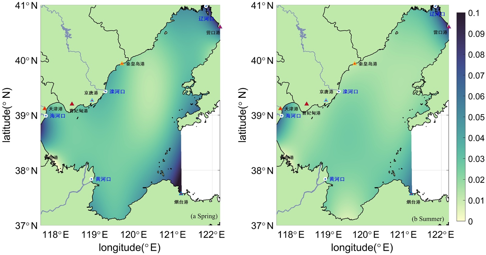 从图中可见,高浓度石油污染主要集中于近岸区域。陆源排放可能是导致渤海油污染的关键因素之一。Yu等发现,渤海正面临由石油平台作业、船舶航行及港口活动引发的多重油污染威胁。近几十年来,每年约有84万吨石油类污染物通过主要河流排入渤海,导致渤海水质持续恶化[4]。与此同时,Wang等运用地理信息系统评估了渤海石油污风险,结果显示辽东湾与渤海湾为高风险区域,陆源输入是渤海石油污染的重要来源[2]。