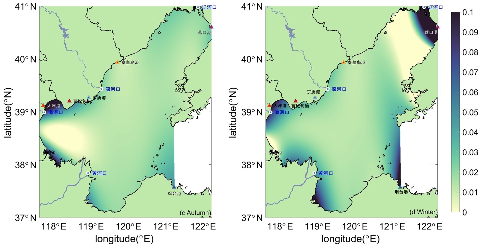 渤海海域石油污染物浓度及水质状况呈现显著的季节性差异。春季河流处于枯水期,陆源石油输入通量减少,但由于渤海半封闭的水体特性,污染物扩散能力较弱,使得沿岸区域石油污染物浓度仍维持较高水平,整体水质大致符合国家I~II类海水水质标准[21]。夏季径流量增加,在水动力稀释、微生物降解、东南风驱动的扩散作用以及高温促进降解等多重因素共同影响下,加之悬浮固体浓度较低,抑制了颗粒态石油的二次释放,石油浓度降至全年最低,水质基本符合国家I~II类标准[22]。秋季陆源输入持续,同时受半封闭地形、水动力扩散减弱、西北风作用及水温下降导致的微生物活性抑制等因素叠加,形成正反馈机制[2],石油污染物逐渐富集,水质明显超过国家I~II类标准,其中渤海湾近岸区域尤为显著。冬季受干旱期径流减少、水体交换能力弱、低温抑制微生物好氧降解、光照不足导致石油蒸发与光解减缓,以及北向季风输送等多重因素耦合影响[23],石油浓度显著超标,污染主要集中于三大海湾的入海口及沿岸区域,以辽东湾右岸最为突出。