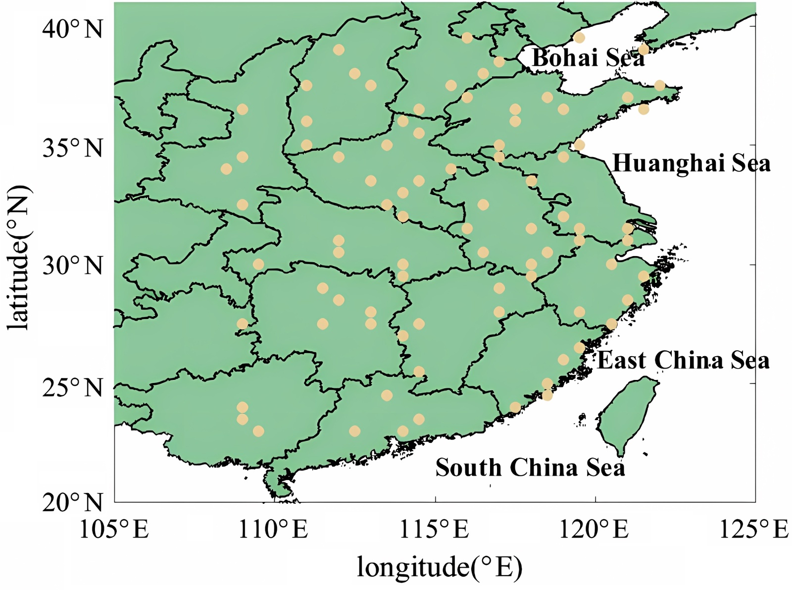 近年来,中国持续推进基础监测网络的科学规划与部署,截至2022年,已建成超过1400个地级监测站,覆盖339个地级市,形成了较为广泛的监测网络。本研究聚焦中国中南部地区,该区域人口密集、经济发展迅速,在全国城市体系中占据关键地位。研究选取该地区85个地面监测站,通过网络爬虫技术获取2015年主要城市的PM10观测数据,数据覆盖2015年3月2日0点至3月5日0点的72小时观测期。将每小时浓度值取平均得到日平均浓度,对于拥有多个监测站的城市,取所有可用测量值的平均值85个监测站的空间分布如图1所示。