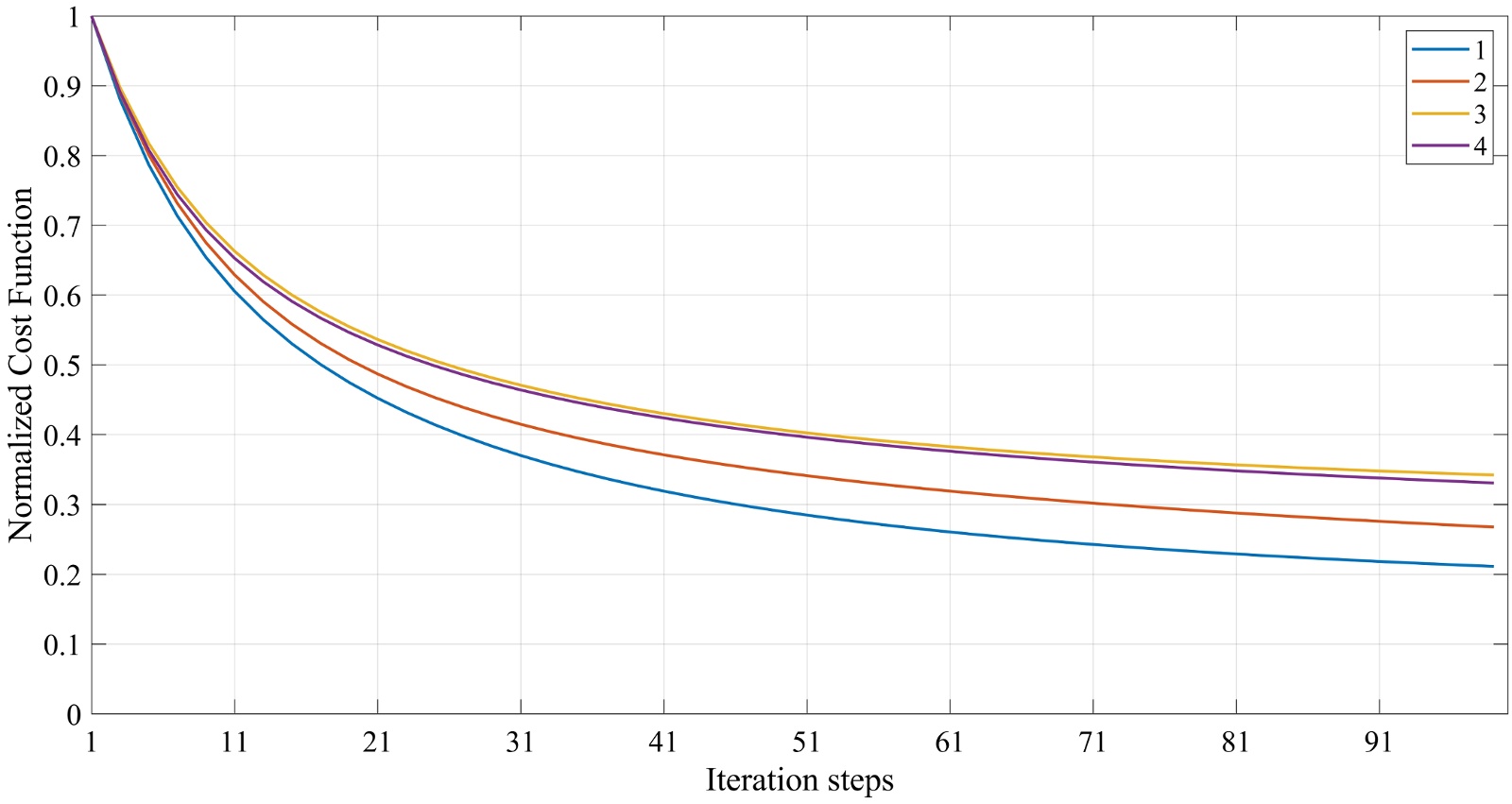 图2. PE11四折交叉实验中四个实验组迭代过程中代价函数的变化