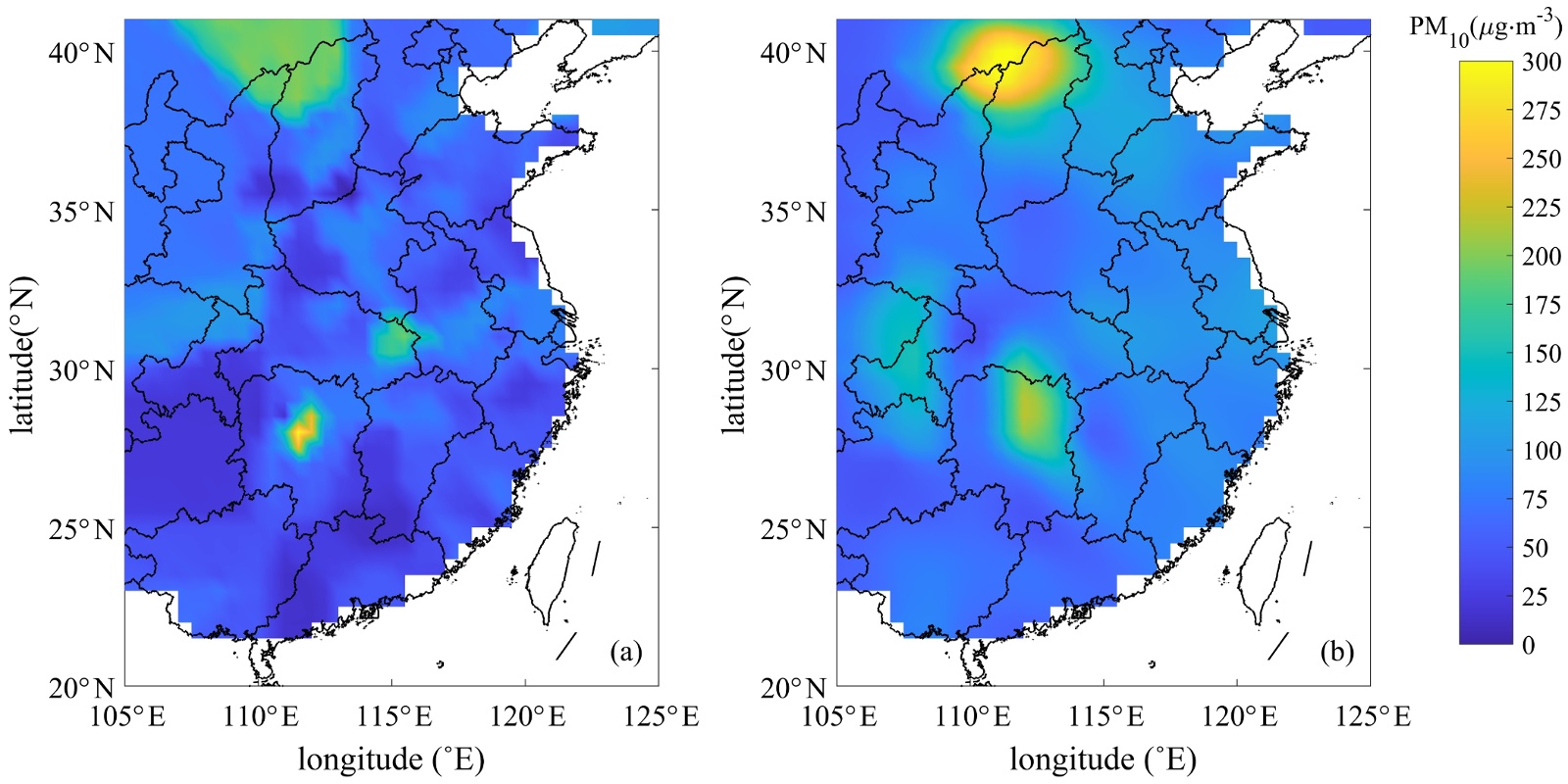 图3. 中国中部和南部85个监测站的日均PM10浓度(2015年3月2日00:00至2015年3月5日00:00)。每个点的颜色深浅表示其日均PM10浓度的大小