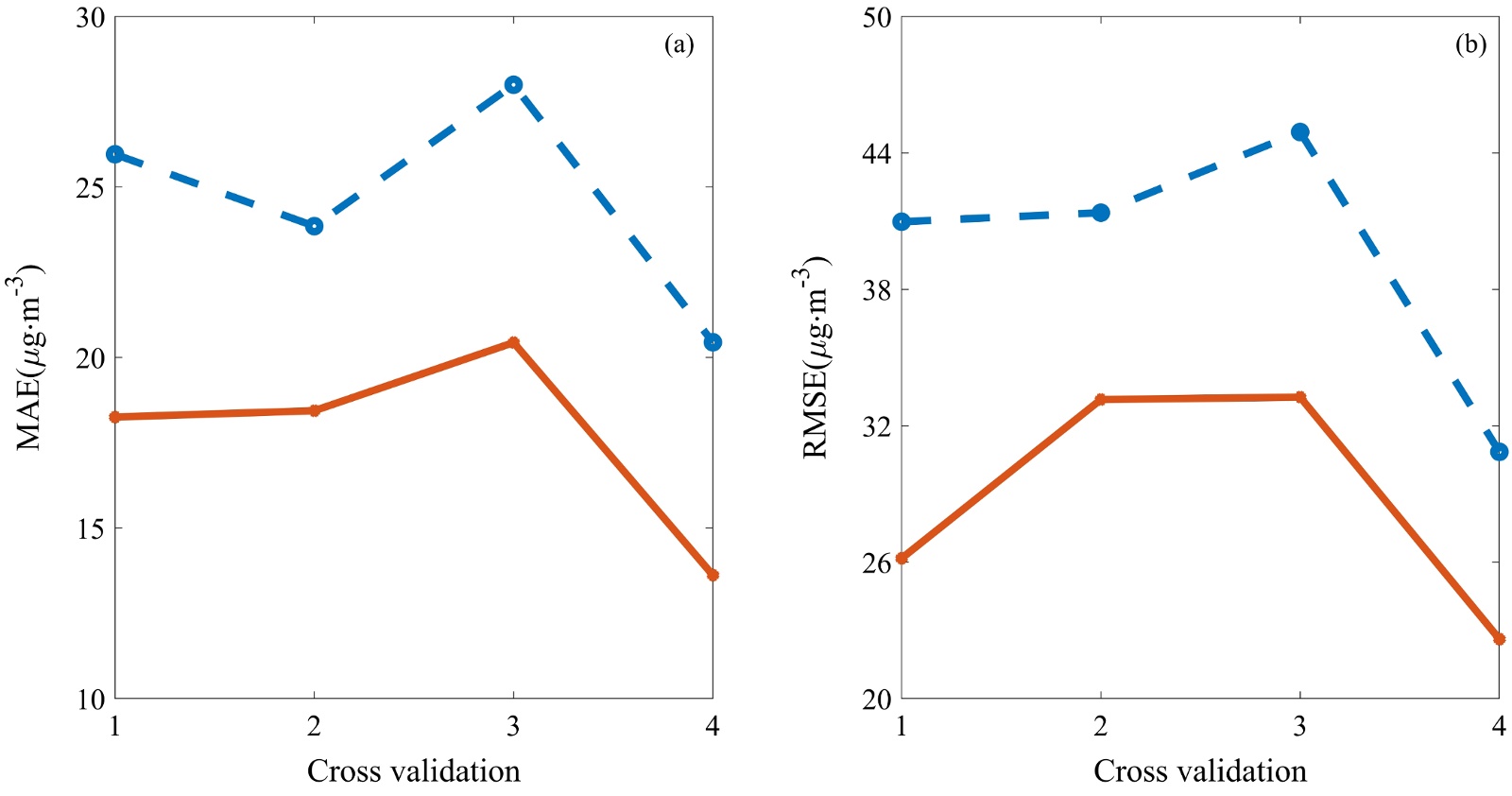Table 2. Comparison of MAE and RMSE between the two methods (unit: μg/m3)