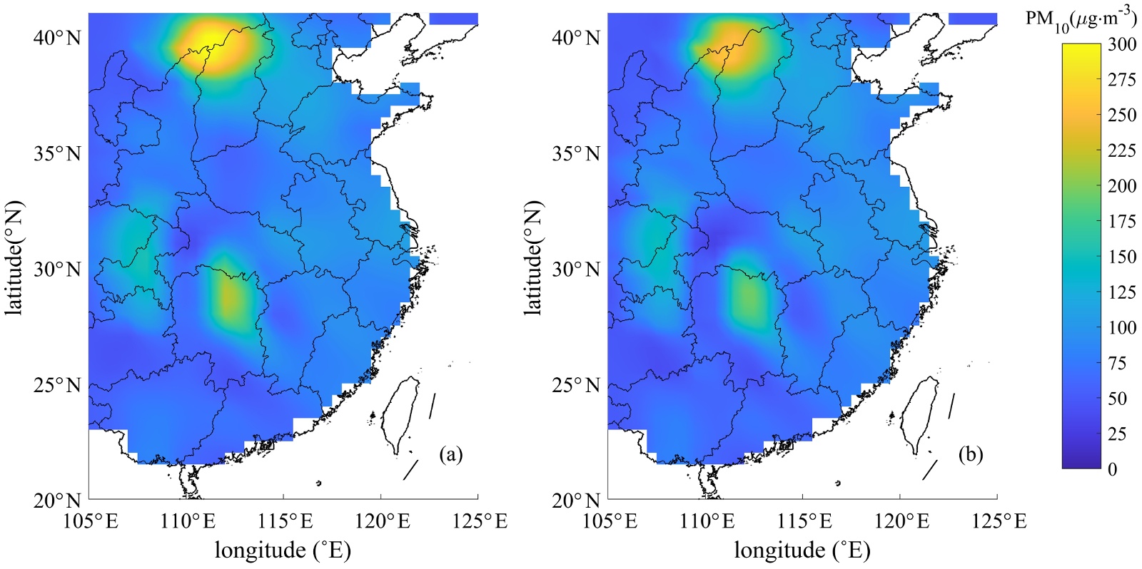 从空间约束有效性来看,研究区域内85个监测站的空间分布不均衡,中南部平原城市群(如长江中下游、珠江三角洲)站点间距约为20~30公里,而内蒙古东部、晋陕蒙边境等区域的站点间距普遍超过50公里,部分区域甚至达到80公里以上,远超本研究模型的有效插值尺度(约40公里)。这种不均衡的稀疏分布导致观测数据无法完整捕捉PM10浓度的空间变异特征,尤其是在无站点覆盖的“数据空白区”,模型只能依赖数学假设与邻域站点的间接推断,使得插值结果的物理真实性难以保证。