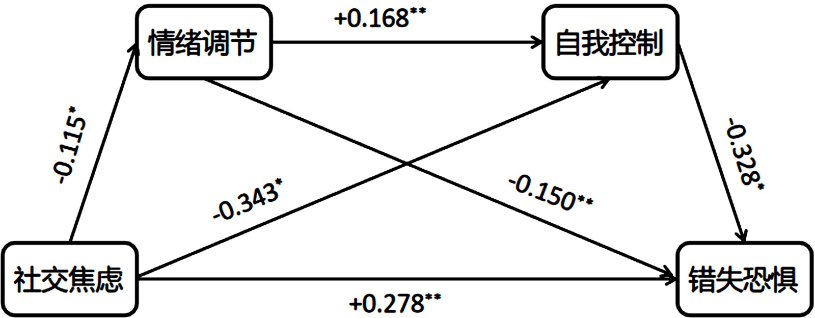 图1. 情绪调节与自我控制在社交焦虑与错失恐惧间的链式中介模型