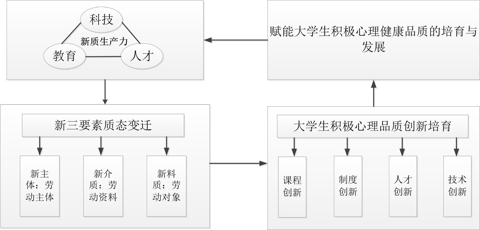 新质生产力对传统产业与服务业的运作模式产生了根本性的革新,同时深刻影响到心理学和教育学领域的重塑,为培养高素质人才奠定了坚实基础。从积极心理学视域看,大学生自立、自强、自信、自律等积极心理品质的培育,本质是其心理资本(Psychological Capital)积累与心理韧性(Psychological Resilience)建构的核心过程,这与教育领域“全人发展”理念及心理健康服务“预防性导向”原则高度契合,亦是高校落实素质教育目标的关键维度。这使得大学生积极心理品质培育在推进社会发展进程中被赋予了特殊的战略高度和历史使命。新质生产力是以科技创新为主导,以培养创新型、复合型、应用型人才为目标的全新生产力格局,本研究将“大数据”、“区块链”等与大学生积极心理品质的培育相融合贯彻,对于充分理解新质生产力对大学生积极品质培育和高素质人才发展具有重要理论与实践意义。鉴于此,将从学理角度深入剖析新质生产力对大学生积极心理培育之间的内在逻辑,在新技术、新要素等基础上探讨路径优化机制,以期提供学理范式和实践应用。