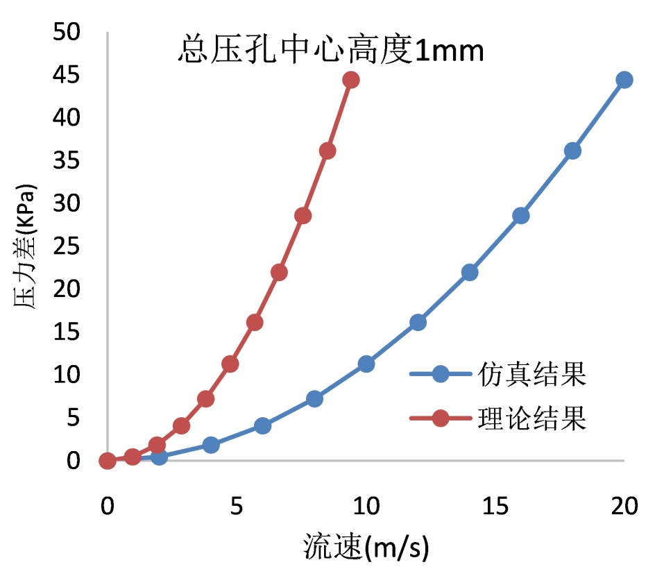 从图6中可以看出,较低的总压孔高度会使得仿真设置的流速与理论计算的流速之间出现较大的偏差,比如总压孔中心高度为1 mm时,修正系数为2.1,而在总压孔中心高度为5 mm时,修正系数为0.99,也即几乎不需要修正。尽管总压孔高度的提升在一定程度上可以使得修正系数更接近于1,但受限于微加工工艺的限制(微米尺度),总压孔高度无法过高。从图5中进一步观察,在总压孔中心高度为1 mm时,2.1的修正系数不至于过大,也即与理论数值偏差不至于过大,仍在可接受的范围之内。此时压力差相对更高的总压孔高度来说较小,灵敏度有所下降,但尚在接受范围之内。因而结合仿真结果与实际工艺要求,总压孔中心高度选择1 mm最为合适。