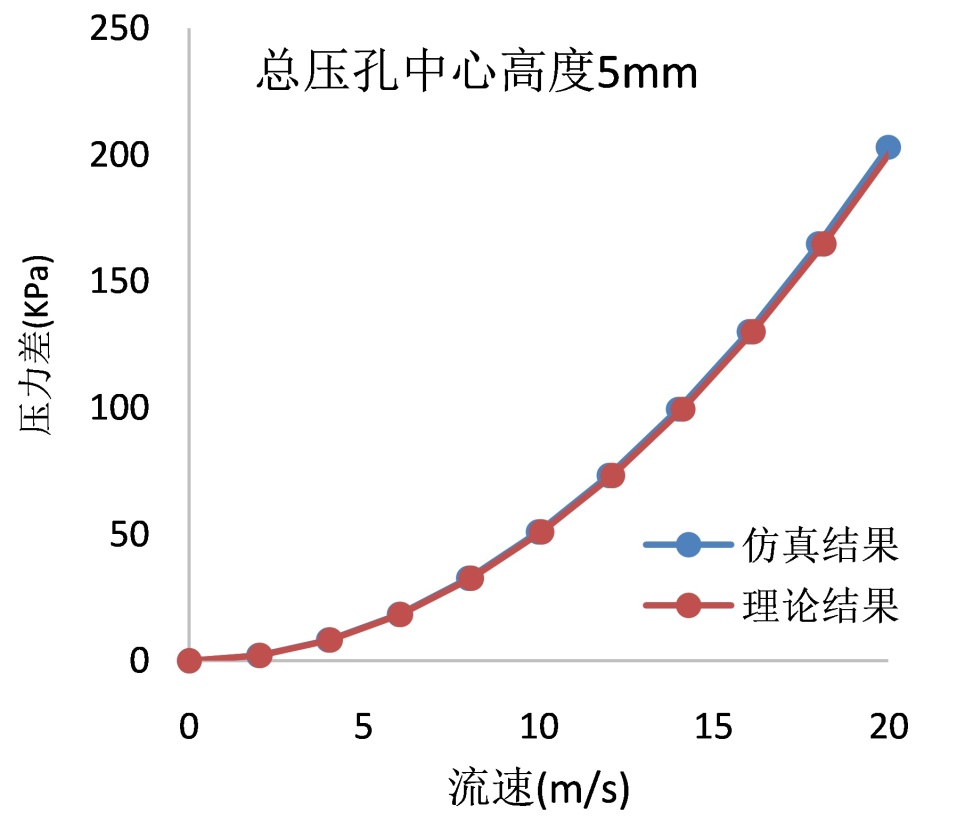 选择1 mm和5 mm两个典型高度分别作仿真分析,并与理论曲线作对比,观察总压孔高度对流速测试结果的影响。其中,1 mm孔高的仿真结果如图3所示。从图中可以观察到,仿真关系曲线与伯努利公式计算结果存在显著差别,仿真结果与理论计算的结果的比值大约是2.1。这种偏差产生的原因正是前文提到的无滑移条件,即在流体越靠近流–固边界流速越慢。上述结果表明,当总压孔高度1 mm时,如果根据测得的压差按照理论公式换算成流速,会使流速测量结果显著偏低,如果要修正测试结果使之与远场流速相符,需要匹配一个数值为2.1的修正系数。