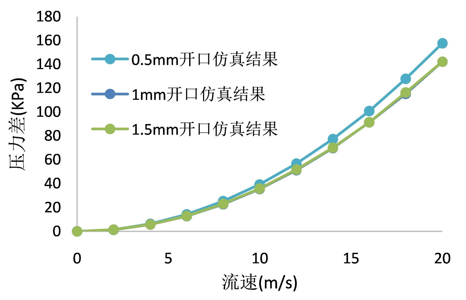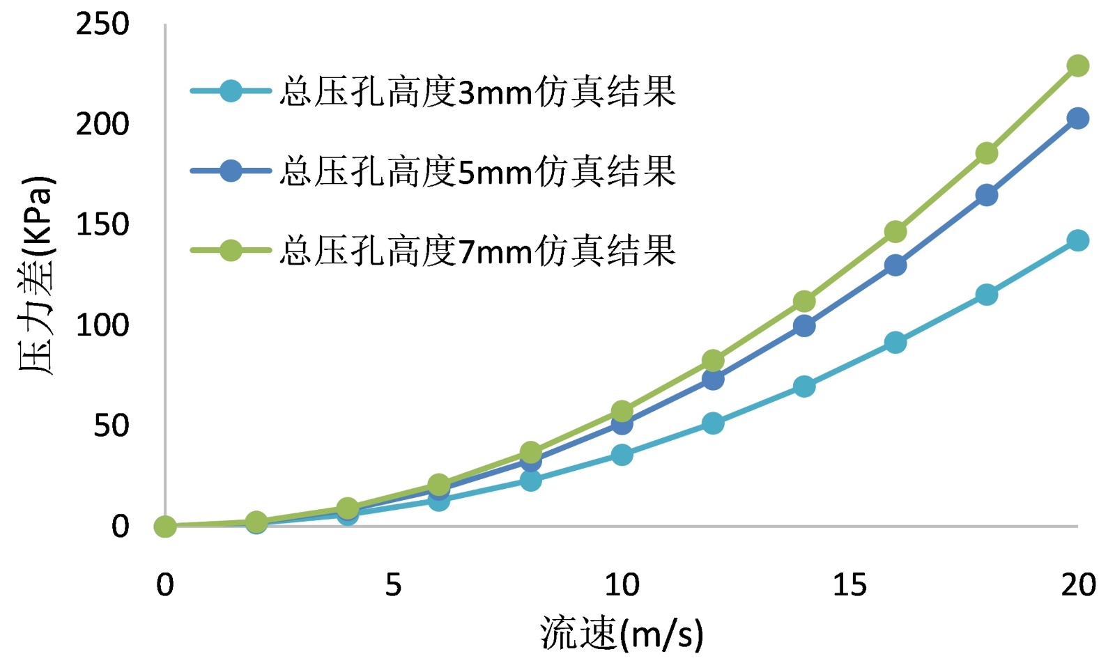 为进一步探究总压孔高度这一关键参数对系统压差特性的影响,我们进行了一系列详细的仿真模拟。通过对不同总压孔高度下的流场进行综合分析,得到了如图5所示的关系曲线。仿真结果清晰地揭示了一个显著趋势:在入口流速保持恒定的条件下,系统的压力差随着总压孔高度的增加而呈现明显的递增关系。这种正相关性在高速流动状态下尤为突出,表明在高流速工况下,总压孔高度的变化对系统压差产生了更为显著的影响。