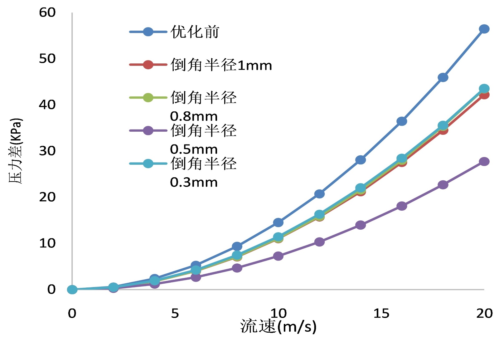 具体来说,当流道关键部位的倒角半径优化至0.5 mm (此为本次研究范围内的最优值)时,取得了最佳的压力改善效果。仿真数据显示,在此最优结构下,系统关键监测面的压力差最大值降低了超过50%;而特定下表面区域的压力差也实现了最高33%的减小幅度。通过仿真曲线也可以看到,压力差与流速的非线性在优化后也得到了相当程度的改善,在高流速情况下尤其明显。