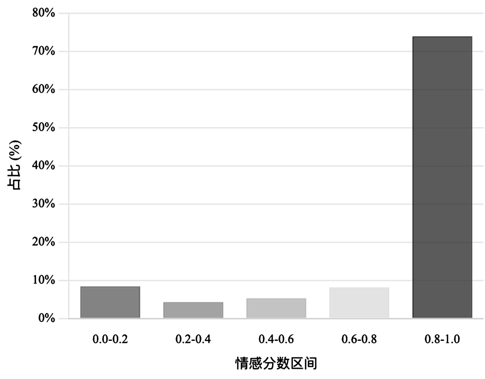 为系统量化用户评论文本的情感倾向,本研究采用基于SnowNLP的中文情感分析框架[17]。该框架基于朴素贝叶斯分类算法,利用大规模中文社交媒体语料训练而成,能够有效识别文本中的情感特征。具体而言,首先对预处理后的评论文本进行特征提取,随后通过SnowNLP情感分类器计算每条评论属于正向情感的后验概率,得到连续型情感得分(score ∈ [0, 1]),得分越高表明文本情感倾向越积极。最终,此得分将作为“情感特征”(见3.4.1节)并入特征向量,从而将抽象情感转化为可量化的模型输入变量。情感分析结果如图1所示,用户评论的情感分布呈现显著正向聚集特征:在全部9334条评论中,高达73.96%的评论情感得分集中在0.8~1.0区间(共6904条),而其他分数段合计占比不足26%。这一分布格局清晰表明,绝大多数用户持积极评价态度,但同时也反映出部分用户持消极评价的情况。该结果印证了情感分析在主题挖掘中的关键作用:若仅关注文本主题而忽略情感维度,则难以全面把握用户态度的整体倾向与强度差异。通过将情感特征纳入分析框架,本研究为用户态度理解提供了量化依据,并有助于揭示潜在的评价动机与满意度驱动因素,从而为数据驱动的实证研究奠定了基础。