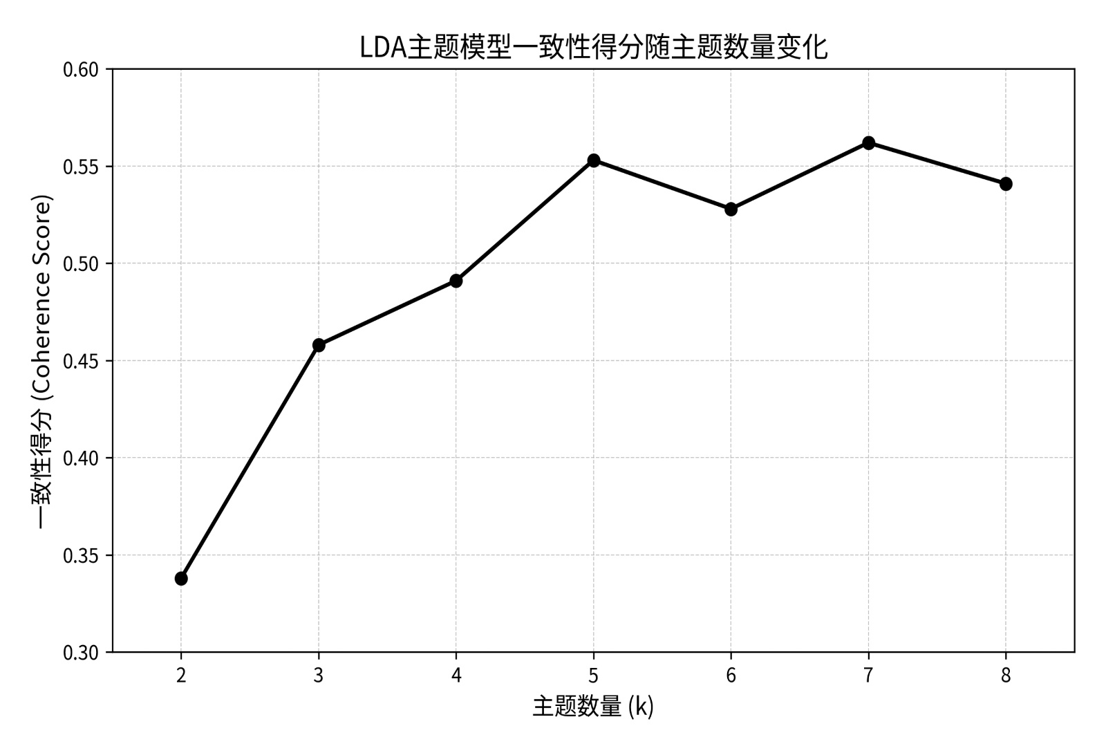 本研究运用GenSim库中的LDA主题模型对评论文本进行主题挖掘。首先,通过计算不同主题数(K)下模型的一致性分数来评估模型质量,结果如图2所示。当主题数设定为5时,一致性曲线出现明显拐点,分数达到一个相对较高且开始趋于稳定的水平。因此,本文选择5作为最优主题数,以期在模型的表达力与解释性之间取得最佳平衡。在此基础上,对预处理后的9334条古村落景区评论数据进行LDA模型训练,并提取每个主题中概率最高的特征词,从而识别出游客讨论的核心内容维度。分析结果最终归纳出五个核心主题,其主题词分布如表1所示。