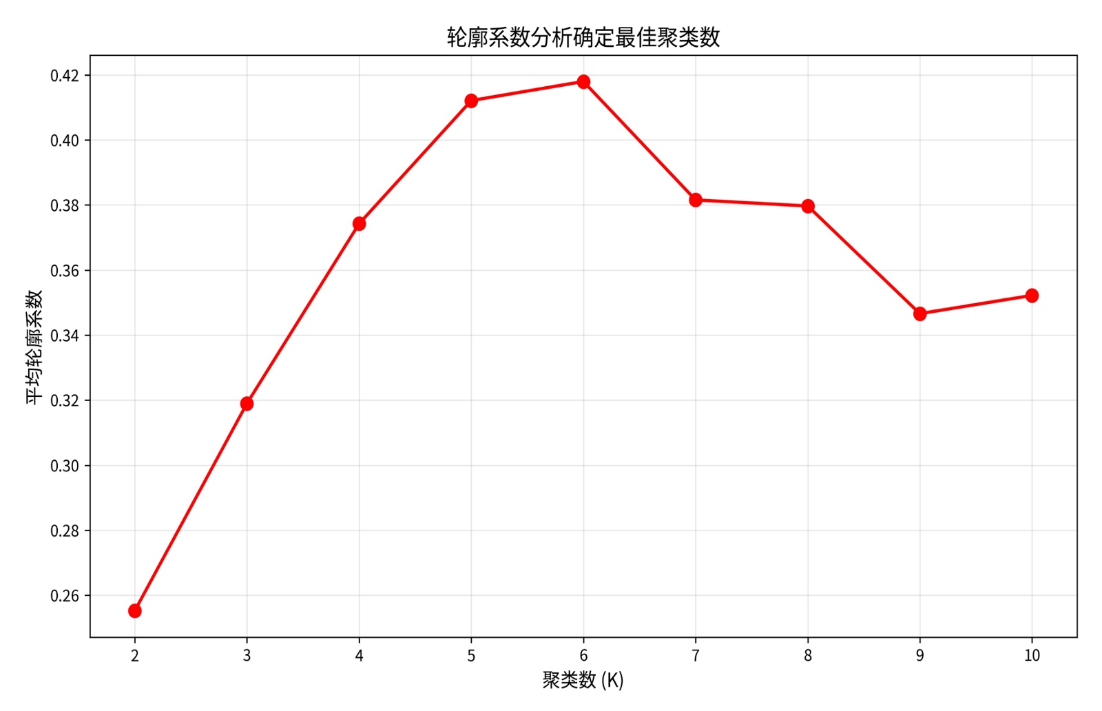 表2. 基于K-Means聚类的用户群体特征分析结果(K = 6,平均轮廓系数 = 0.418)