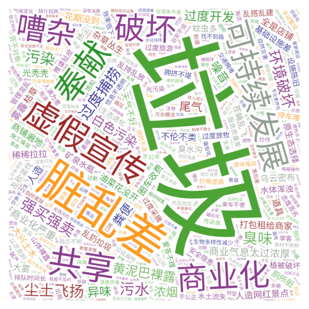 ① 环境批判者(簇0)。“环境批判者”是基于聚类分析识别出的关键用户群体。其画像特征表现为一种鲜明的矛盾性:在主题分布上高度聚焦于“自然生态环境”(主题权重达0.725),但平均情感得分却位列最低(仅为0.1442)。文本分析进一步揭示了其负面态度的焦点:高频词(图5)如“商业化”、“嘈杂”、“失望”、“破坏”、“垃圾”等占据主导。典型评论如“商业化太严重了,失去了古村的宁静”及“河里能看到垃圾,生态保护令人担忧”。这些内容表明,该群体的负面评价主要源于对观察到的环境破坏、商业过度开发以及现实与预期落差的强烈不满,这反映出他们是一群对原生态与宁静氛围有较高要求的游客。因此,该用户画像的价值在于,其评论数据构成了景区生态管理与商业规划的高敏感性预警指标。针对此群体的反馈进行有效干预,对防范口碑风险、提升整体满意度和实现古村落可持续发展具有关键意义。