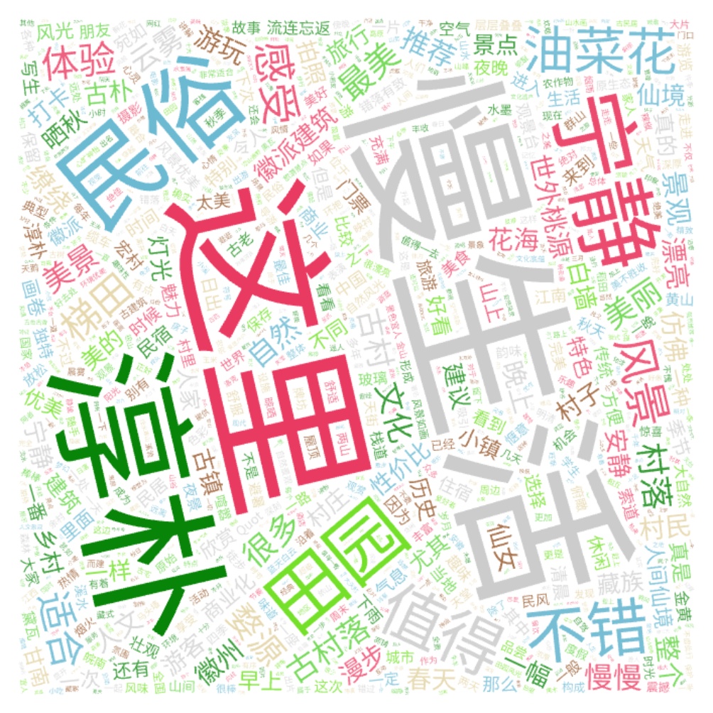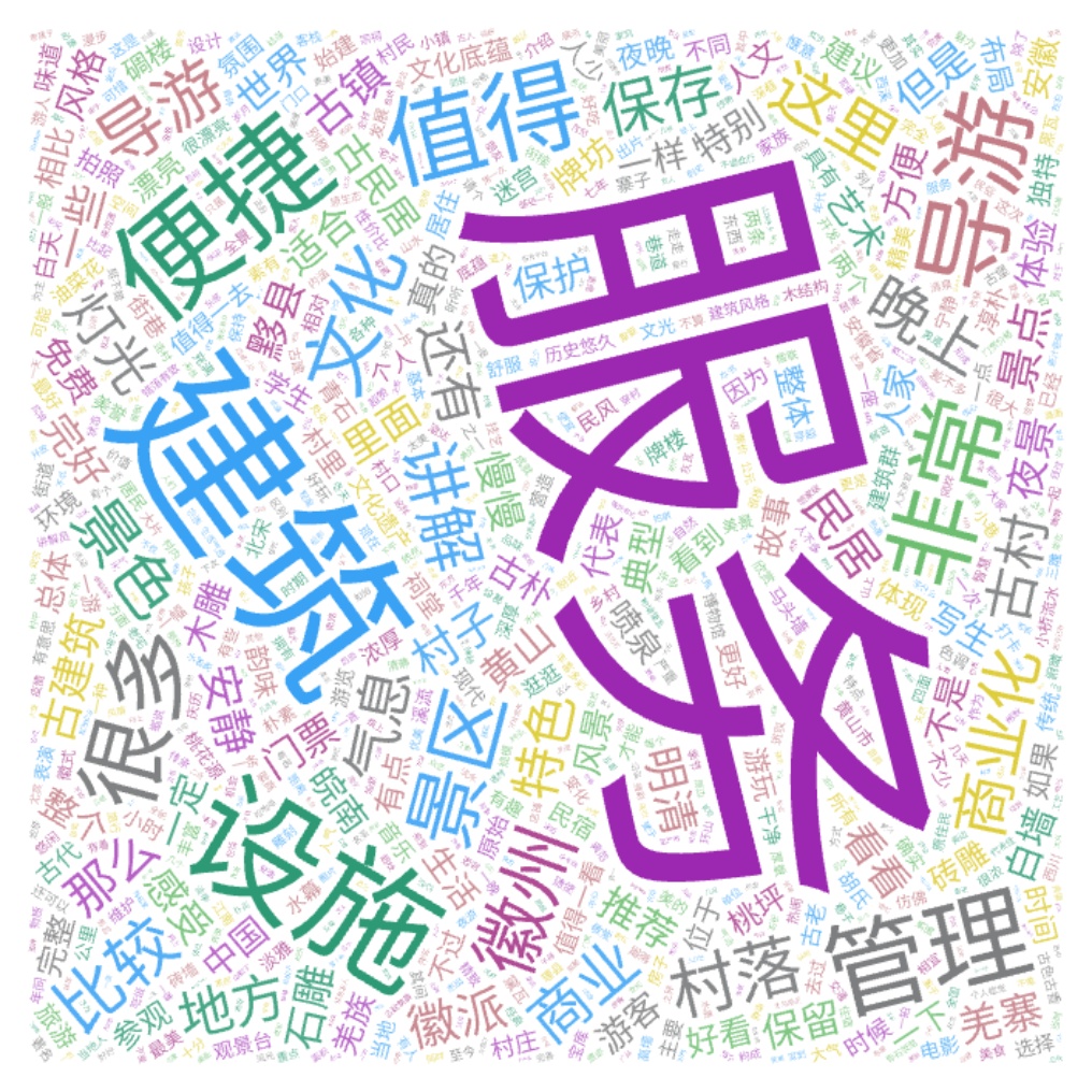 该主题结构表明,游客对古村落景区的关注呈现多元化特征,其中自然生态环境为核心议题。该结果为古村落景区服务质量优化与精准营销策略制定提供了数据支持,例如针对生态旅游爱好者突出“绿水青山”理念,或面向文化探索者强化历史建筑保护与展示。