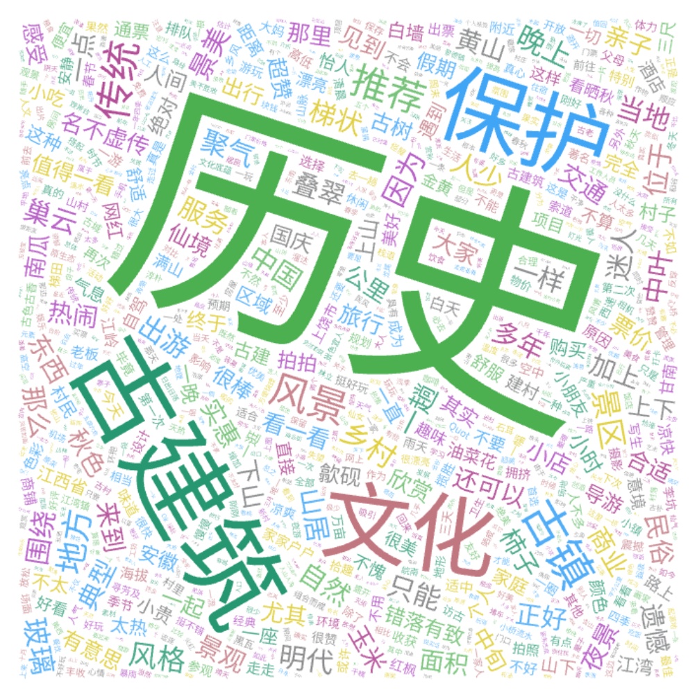 ④ 历史人文探索者(簇3)。“历史人文探索者”是基于聚类分析识别出的文化导向型用户群体(集群规模占比22.4%),其画像特征表现为对历史文化内涵的深度关注与高度认可。该群体在主题分布上显著集中于“历史文化建筑”(主题权重达0.6556),且情感得分处于较高水平(0.8889),反映出其文化体验满意度与情感投入的深度一致性。文本分析进一步揭示了其核心关注点:高频词(图8)如“古建筑”“历史”“文化”“传统”“保护”等占据主导地位。典型评论如“徽派建筑的雕刻工艺精湛,每一处细节都承载着深厚的历史底蕴”及“通过导游的讲解,深刻感受到这座古村落的文化传承,仿佛穿越时空与历史对话”。这些内容表明,该群体的积极评价主要源于对古建筑艺术价值的欣赏、历史文脉的感知以及文化遗产保护效果的认可,反映出他们是一群注重知识获取、追求精神共鸣的深度文化体验者。因此,该用户画像的价值在于,其评论数据不仅验证了景区文化遗产资源的吸引力,更构成了文旅融合深度发展的关键依据。针对此群体对专业性、知识性文化体验的核心诉求,优化深度解说系统、开发互动式文化项目及强化遗产保护展示,对提升文化旅游品质、强化学术影响力及实现古村落可持续发展具有重要战略意义。