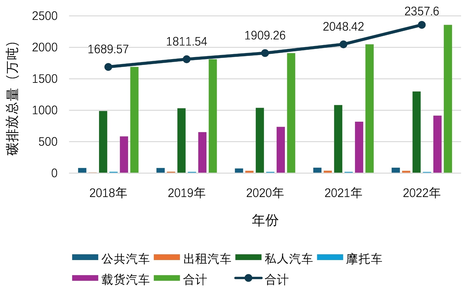 本文基于2018~2022年成都市道路交通碳排放数据,构建“自下而上”测算模型,系统分析了公共汽车、出租汽车、私人汽车、摩托车与载货汽车等五类交通方式的碳排放特征,并结合电商物流与即时配送的发展趋势,对城市配送体系的低碳化挑战进行了深入探讨。研究结果表明:成都市道路交通碳排放总量在五年间由1689.57万吨上升至2357.60万吨,增长约40%,呈持续攀升态势。